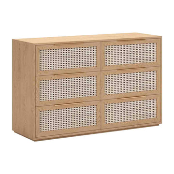 Taking centre stage in this oasis is the elegant design of the Norah Rattan Bed, with the natural tones of the solid oak frame and warmth of the fisheye woven rattan bringing a nostalgic edge to this contemporary space. The continuation of the rattan and oak pairing in the clean lines and timeless design of the Cuba Rattan Chest of Drawers anchors the space, providing ample storage and the perfect place for a mirror. Both decorative and functional to add an aspect of depth, the Bjorn Arch Mirror will brighten this space by reflecting the natural light to create its airy coastal look.