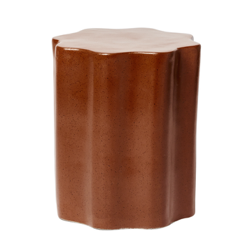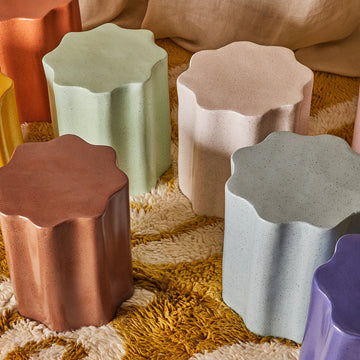 Complementing the room's curated elegance are the duo of Piscina Side Tables used here as bedsides. Their Cosmos marble tops and gloss steel legs merge strength with style, whilst creating contrasting textures against the boucle and rug textile. The Marcelle Table Lamps sit atop these tables and glow like a modern-day orb, diffusing a warm light that highlights the rust tones of the linen blend Domenica Cushions. The wavy frame of the Artemis Mirror and abstract sophistication of the Moderne Poster Print bring in curves and artistic expression, creating visually balanced elements of interest to the walls.