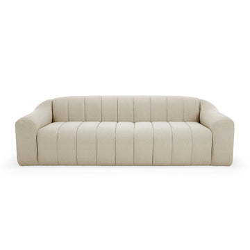 Adding a luxurious touch, the Camille Boucle 3-Seater Sofa is poised nearby. Its curvaceous silhouette and quilted stitching details blend contemporary style with premium comfort in a stunning boucle upholstery. As light descends from the Hoff Floor Lamp onto the sofa, its antique gold body is elevated further via its opal matt ribbed glass shade.