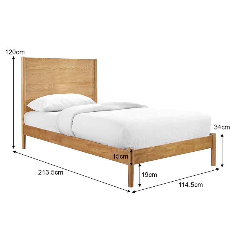 Solid timber frame, timber veneer bed head, low profile, tapered legs, available in various sizes and finishes.
