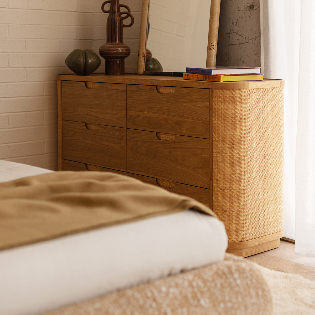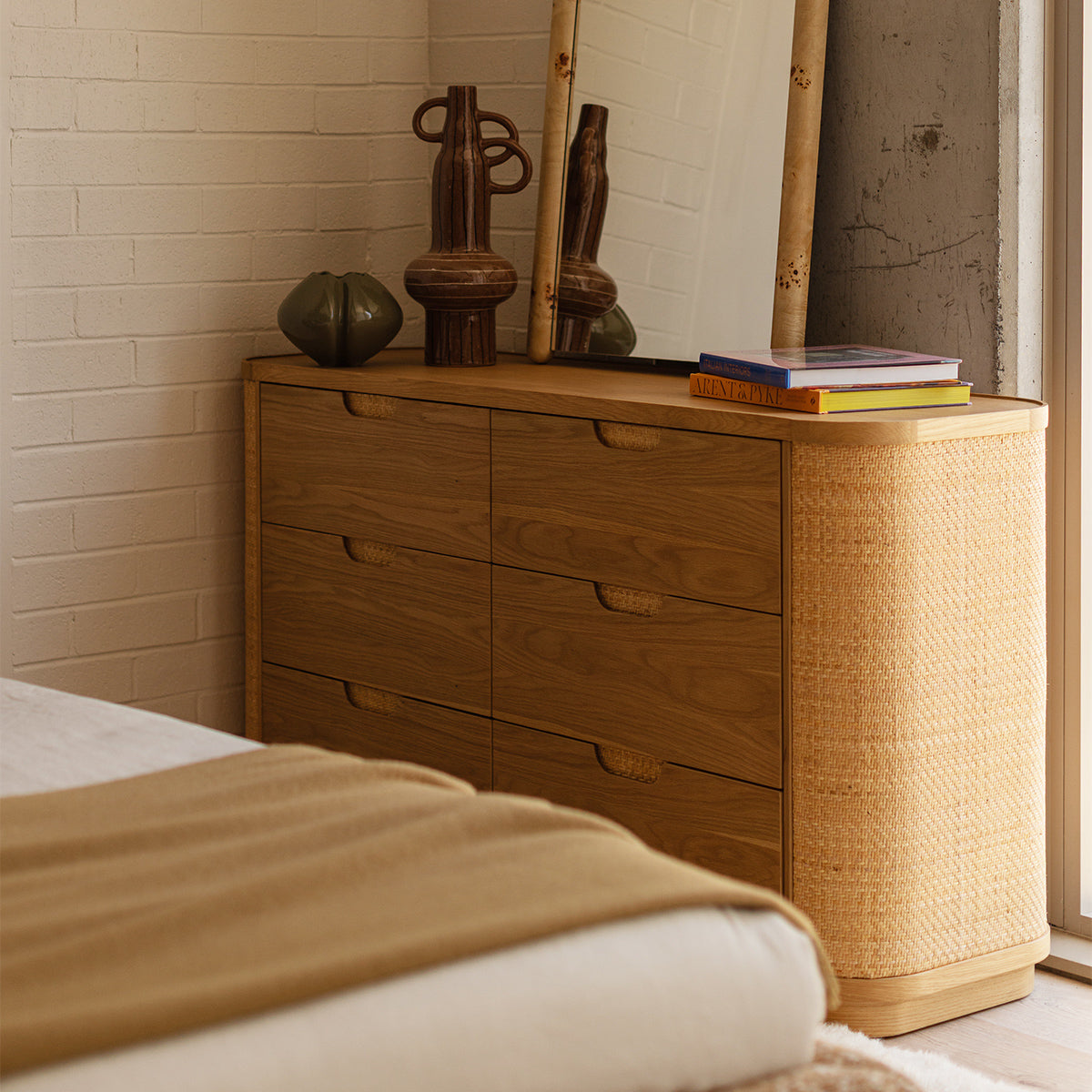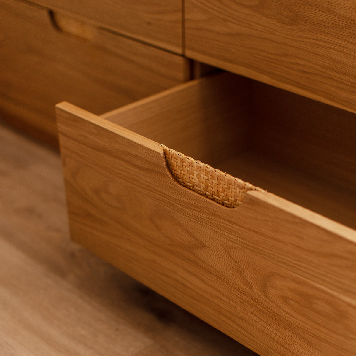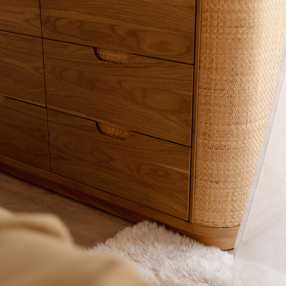 Oak veneer construction, rattan design, 6 drawers, soft-close mechanism.