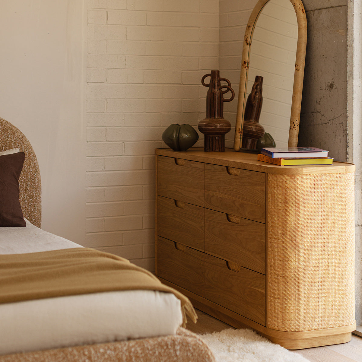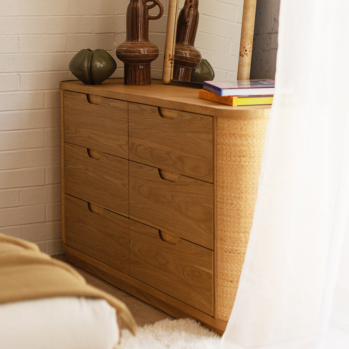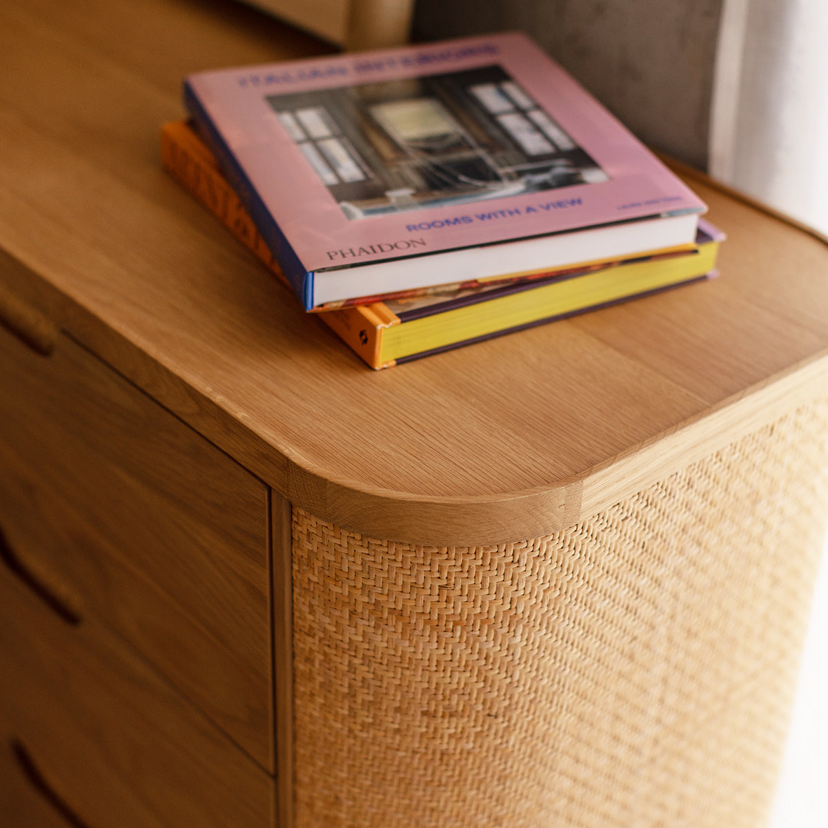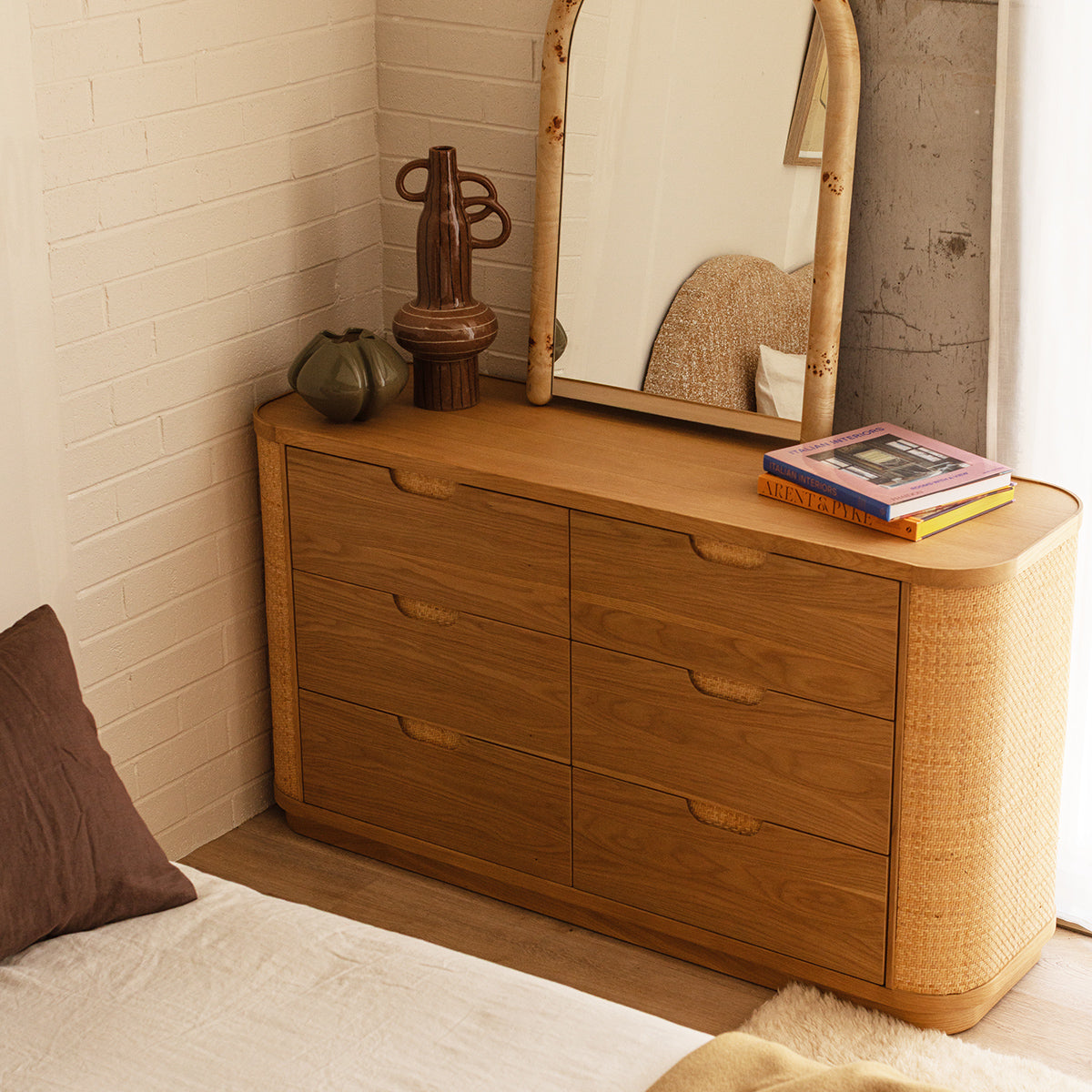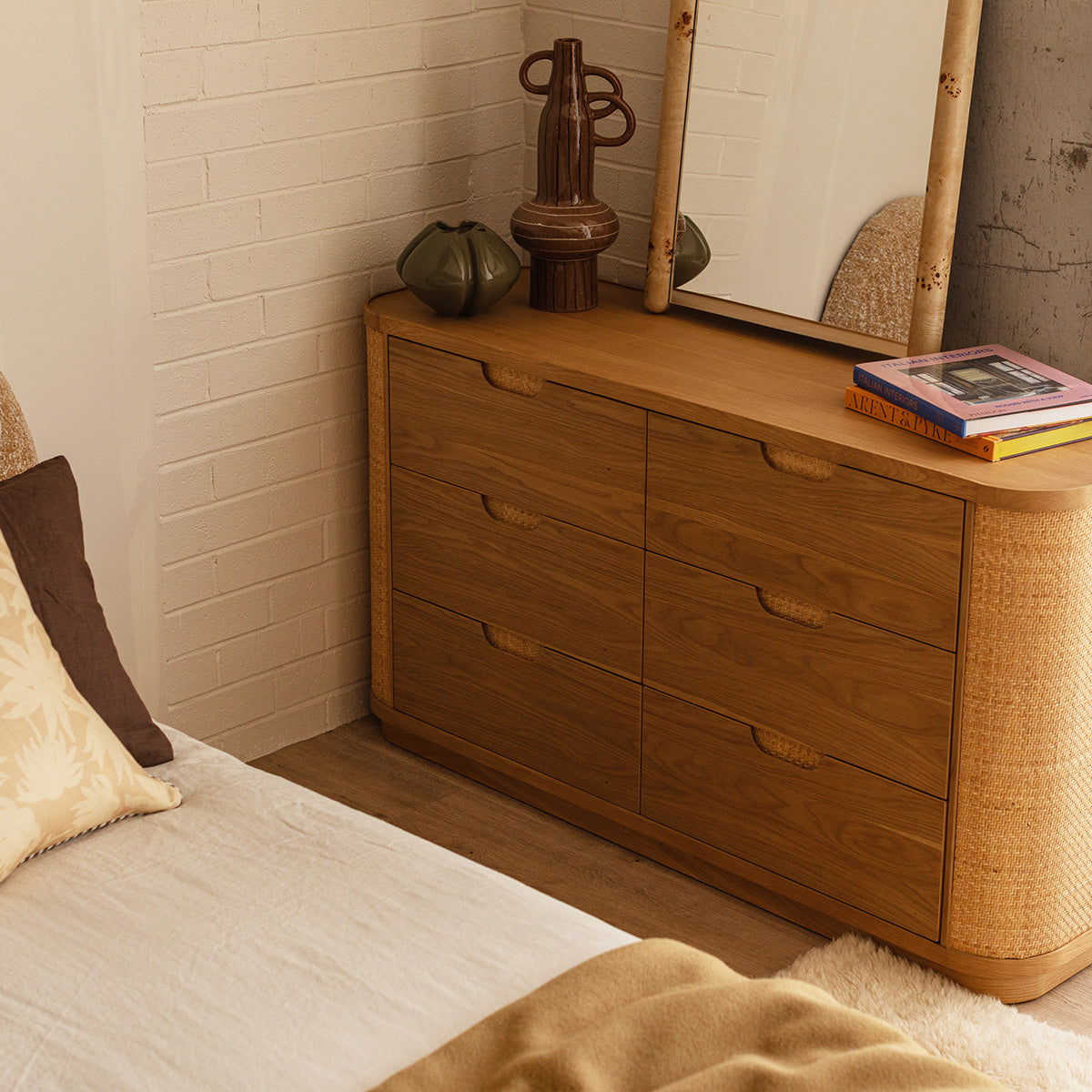 Oak veneer construction, rattan design, 6 drawers, soft-close mechanism.