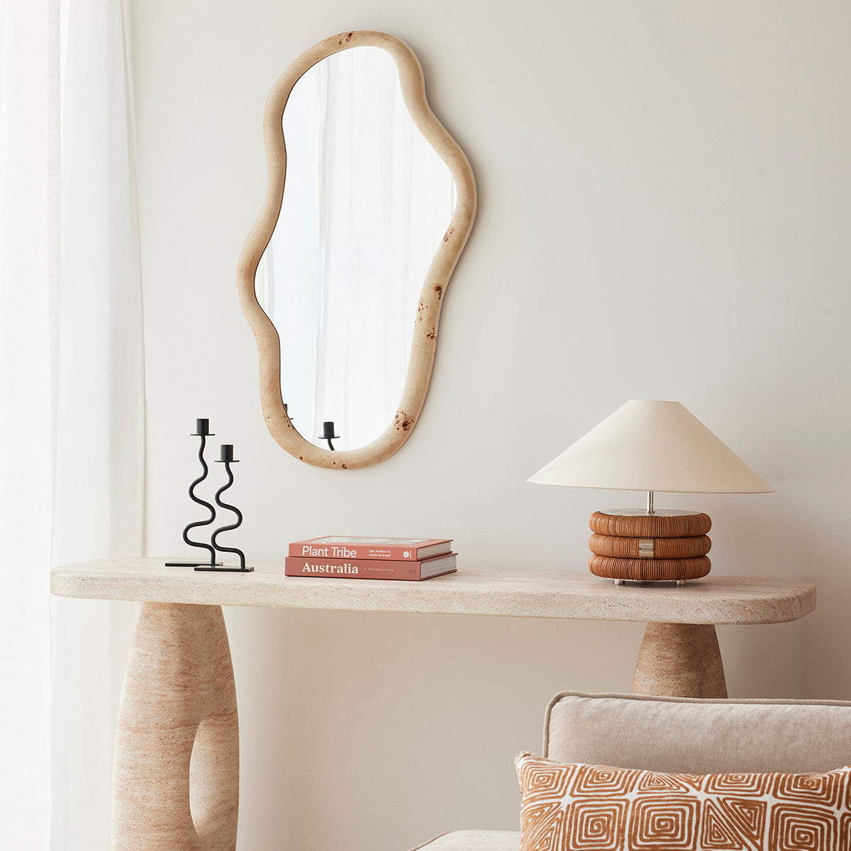 The Sorrento Organic Wall Mirror brings sculptural elegance to your home with its fluid, free-form silhouette and beautifully textured burl finish. Inspired by natural contours, its softly undulating frame creates a striking visual statement while maintaining an effortless, organic feel.