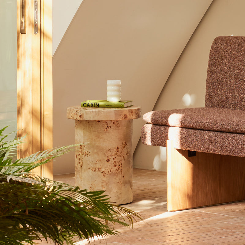 Burlwood veneer construction, curved design, pair with matching Valentina pieces.
