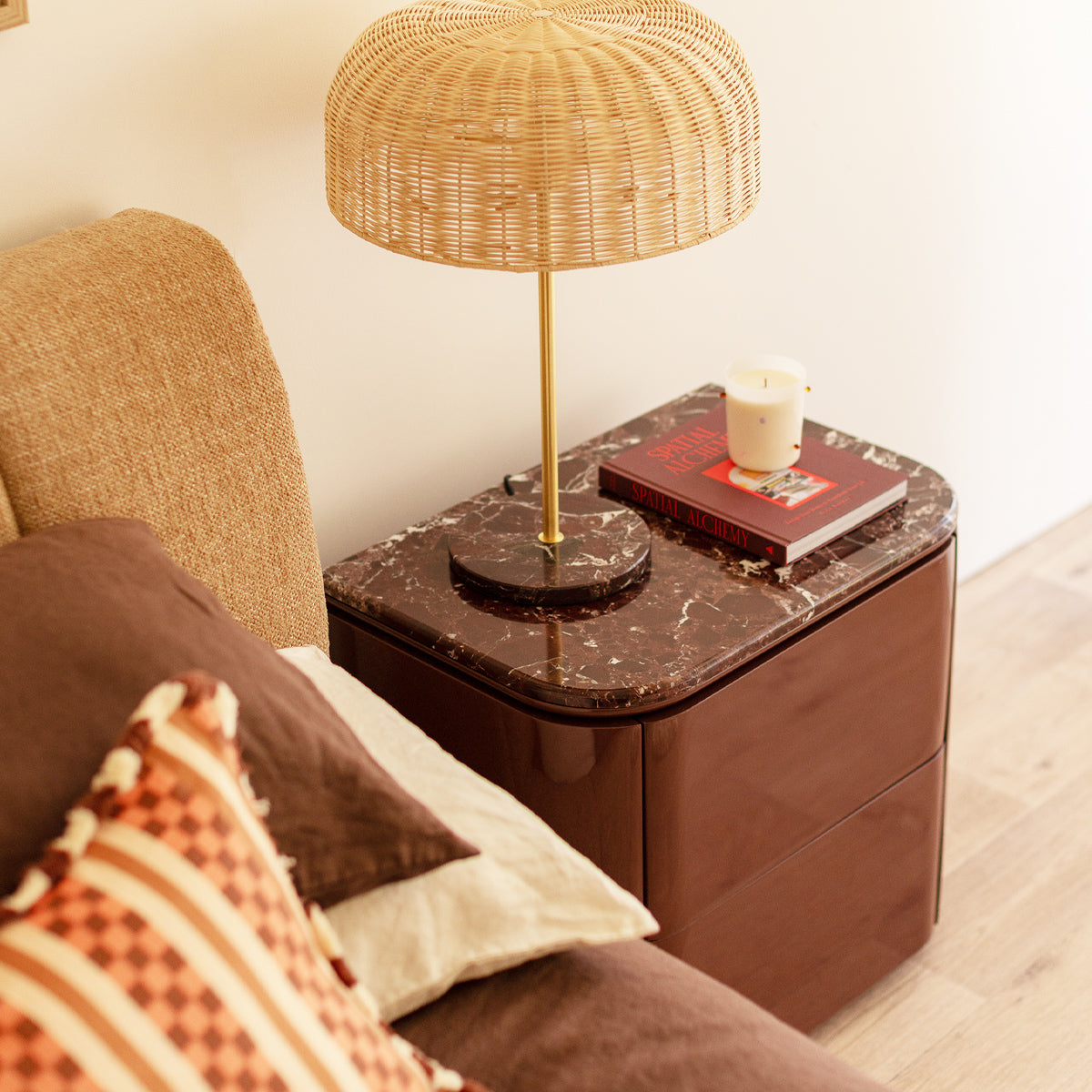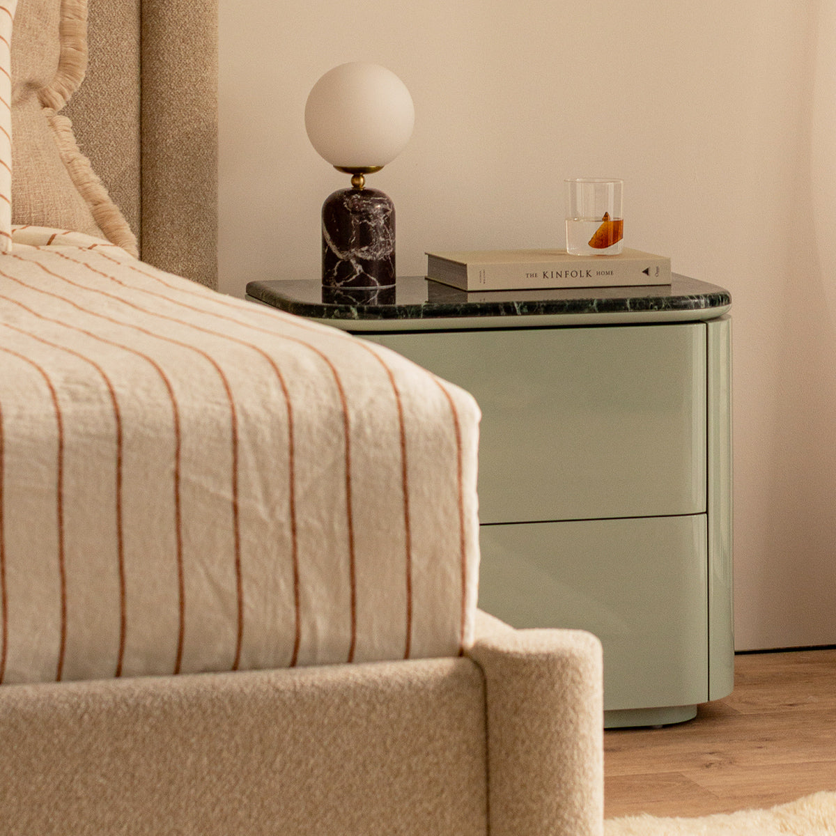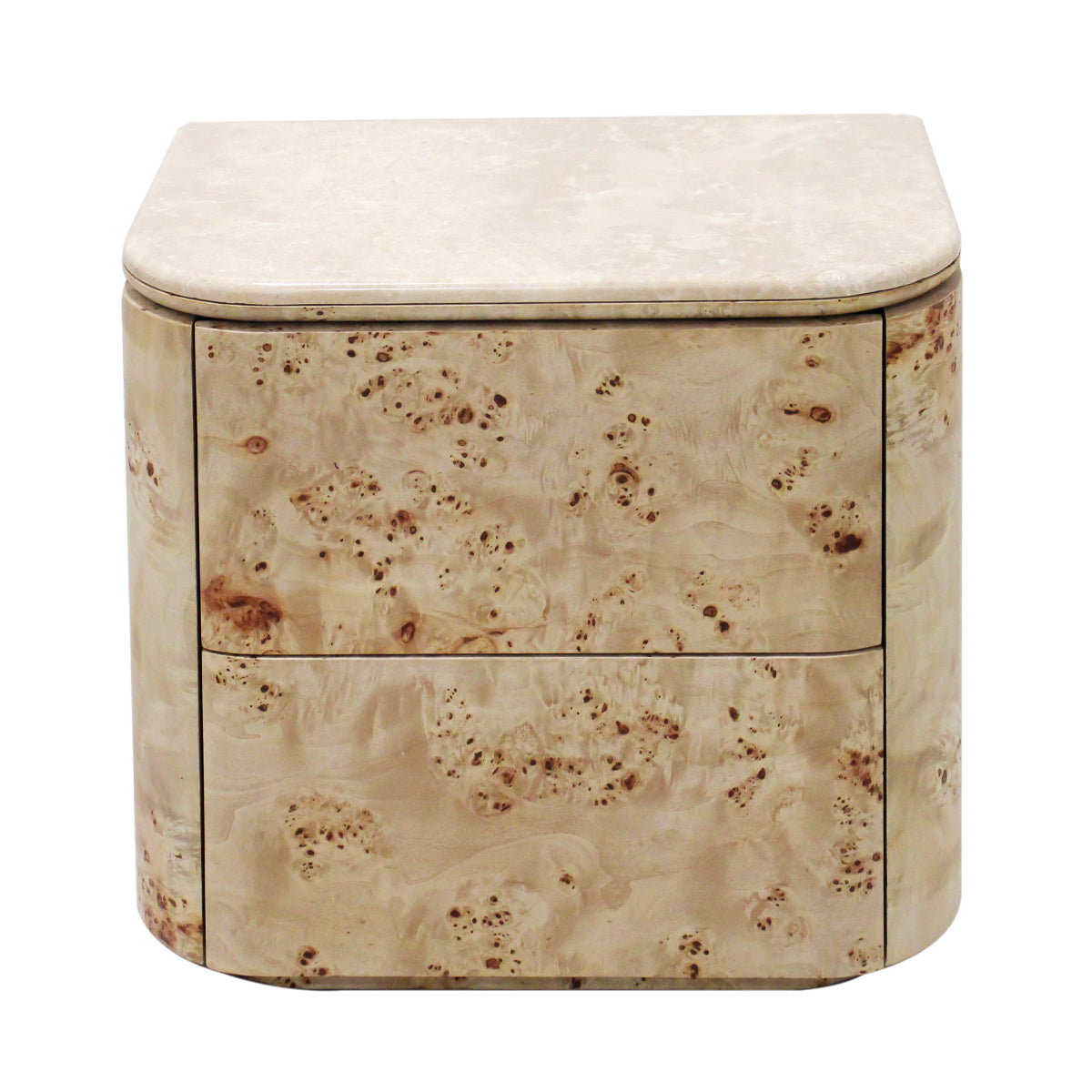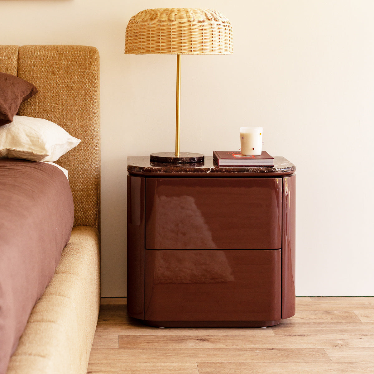 The Carmella Marble Bedside Table brings a refined, modern elegance to your bedroom with its seamless curves and luxurious material palette. Designed with sculptural simplicity in mind, its rounded form is finished in a high-gloss lacquer or burlwood veneer, creating a soft, contemporary statement beside the bed.