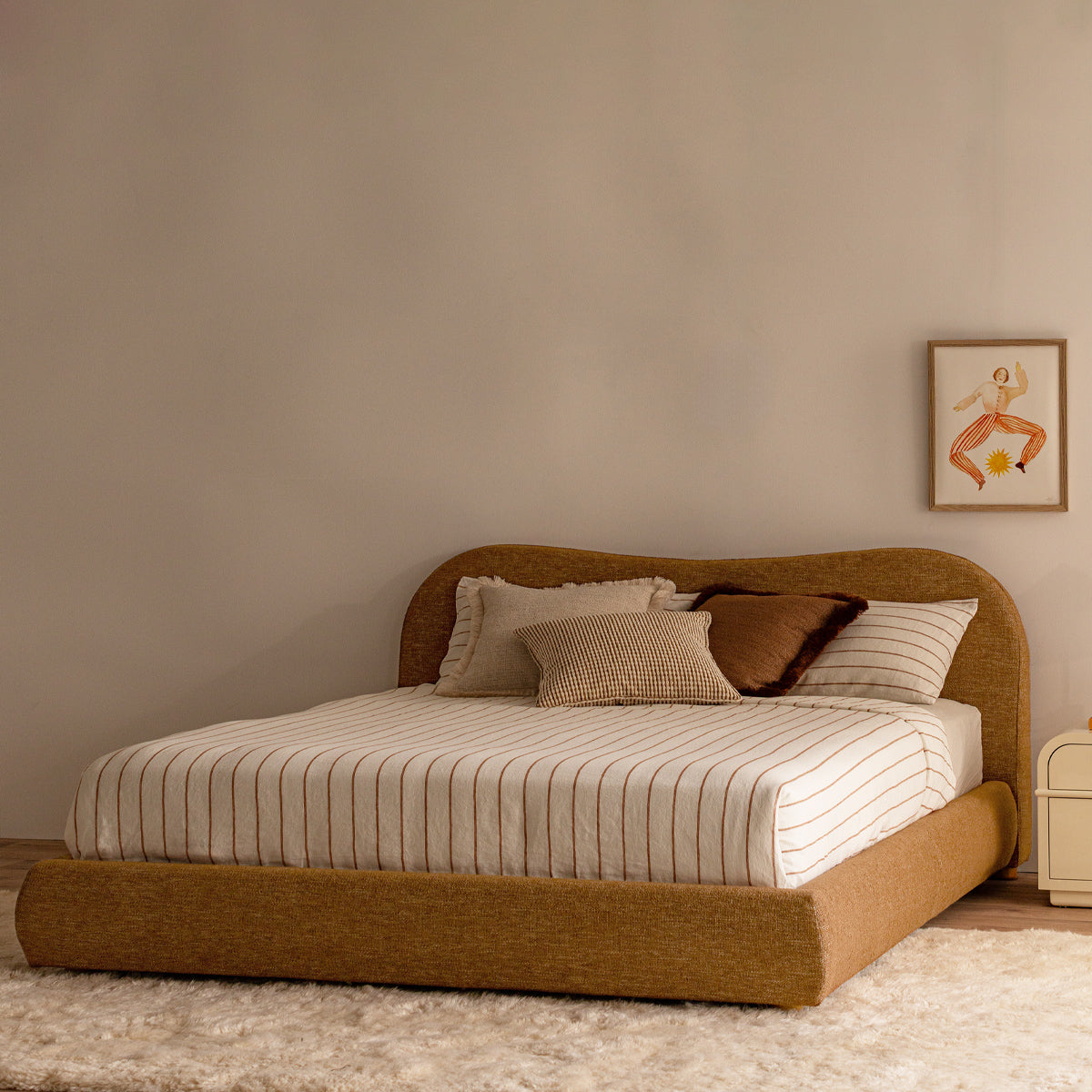 King Bed with complete cream boucle, cushioned upholstery with a curved bed head and short, rubber wood legs.