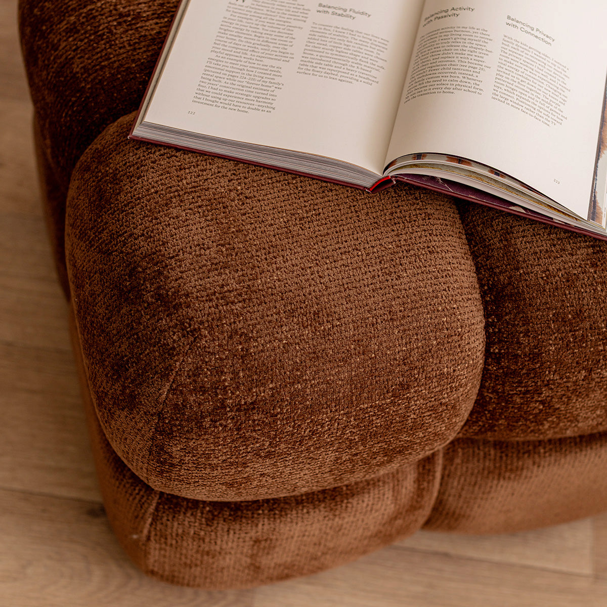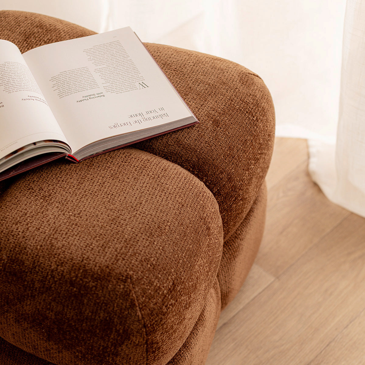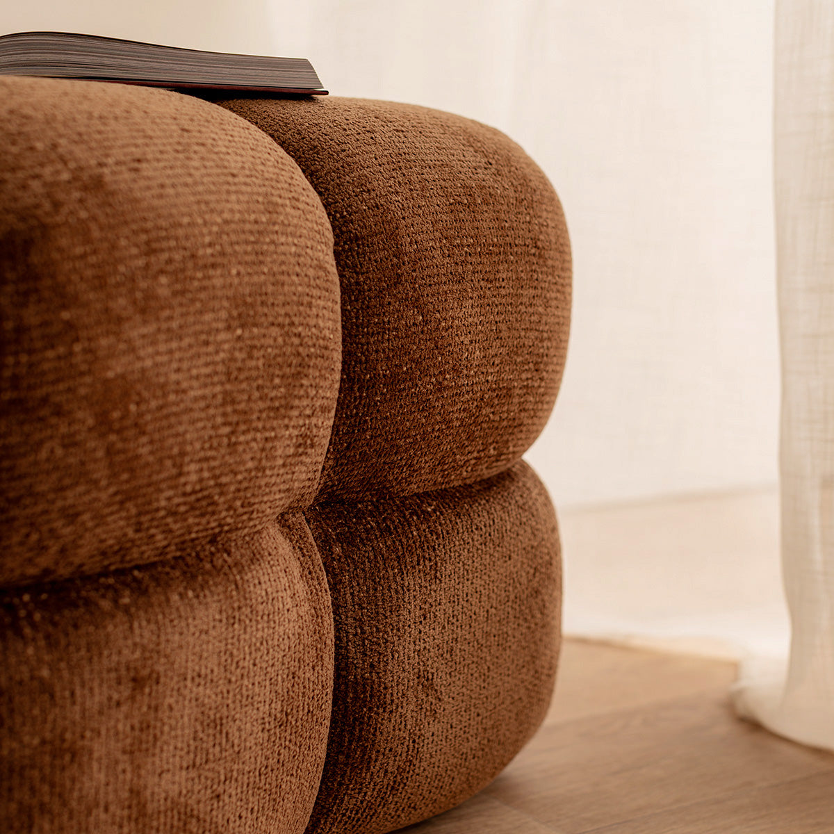 Textured weave fabric upholstery, square shape with curvy edges, available in various colourways.