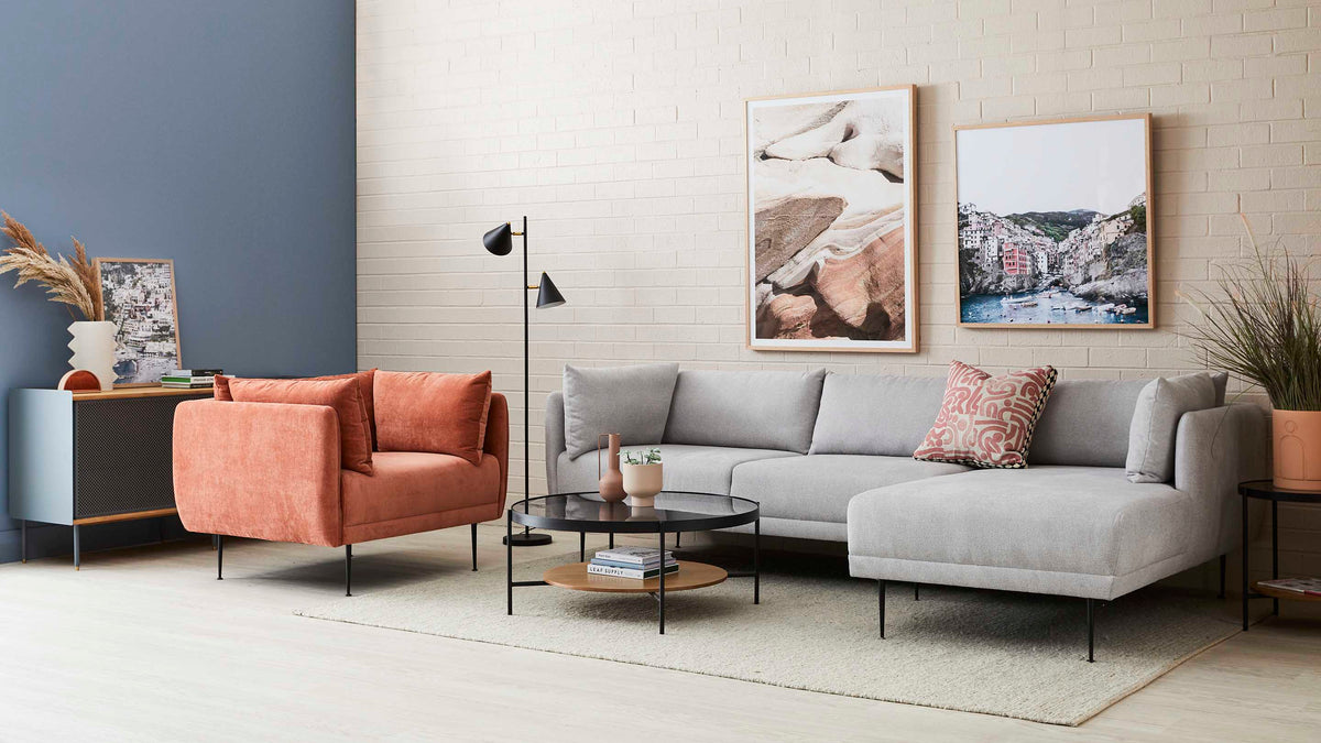 A grown-up living room for those of you looking to upgrade, we are pleased for you to meet our Memphis Range. With an L shaped lounge, 3 seater sofa and armchair which can be mixed and matched in shades of grey, dusty rose, and forest or white boucle for a contemporary take on a lounge suite. This room in particular has cool but cosy tones, and includes our new modern Cape cabinet and Glam tables, plus, oversized prints from our friends at Middle of Nowhere.