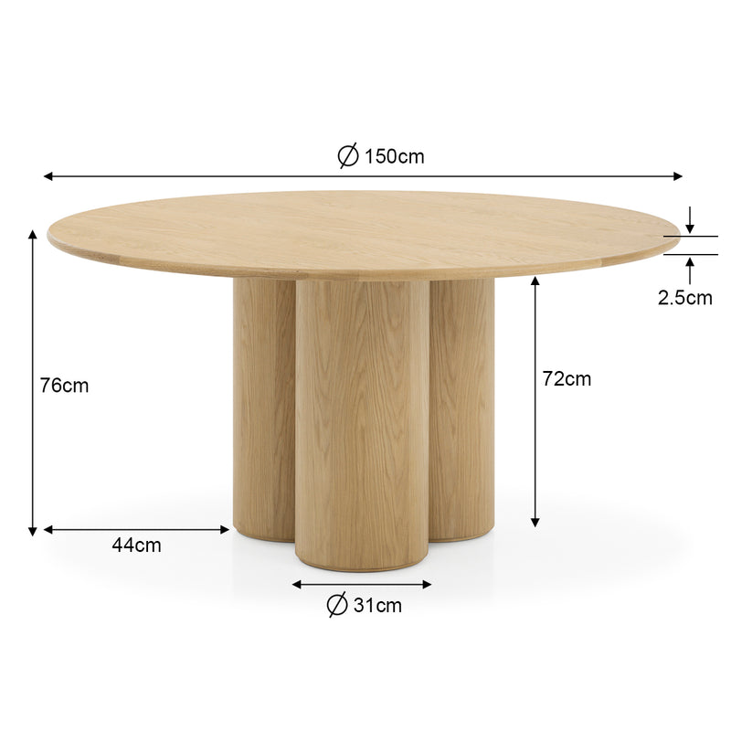 The Monti Dining Table is a sculptural centrepiece designed to elevate any contemporary dining space. It features a striking trio of pillar-style legs that anchor the design with visual weight and architectural interest. Crafted from timber, the simple round tabletop provides visual balance to the legs, working harmoniously to create a balanced overall finish. Perfect for intimate meals or stylish entertaining, this table will be a timeless focal point in your home.