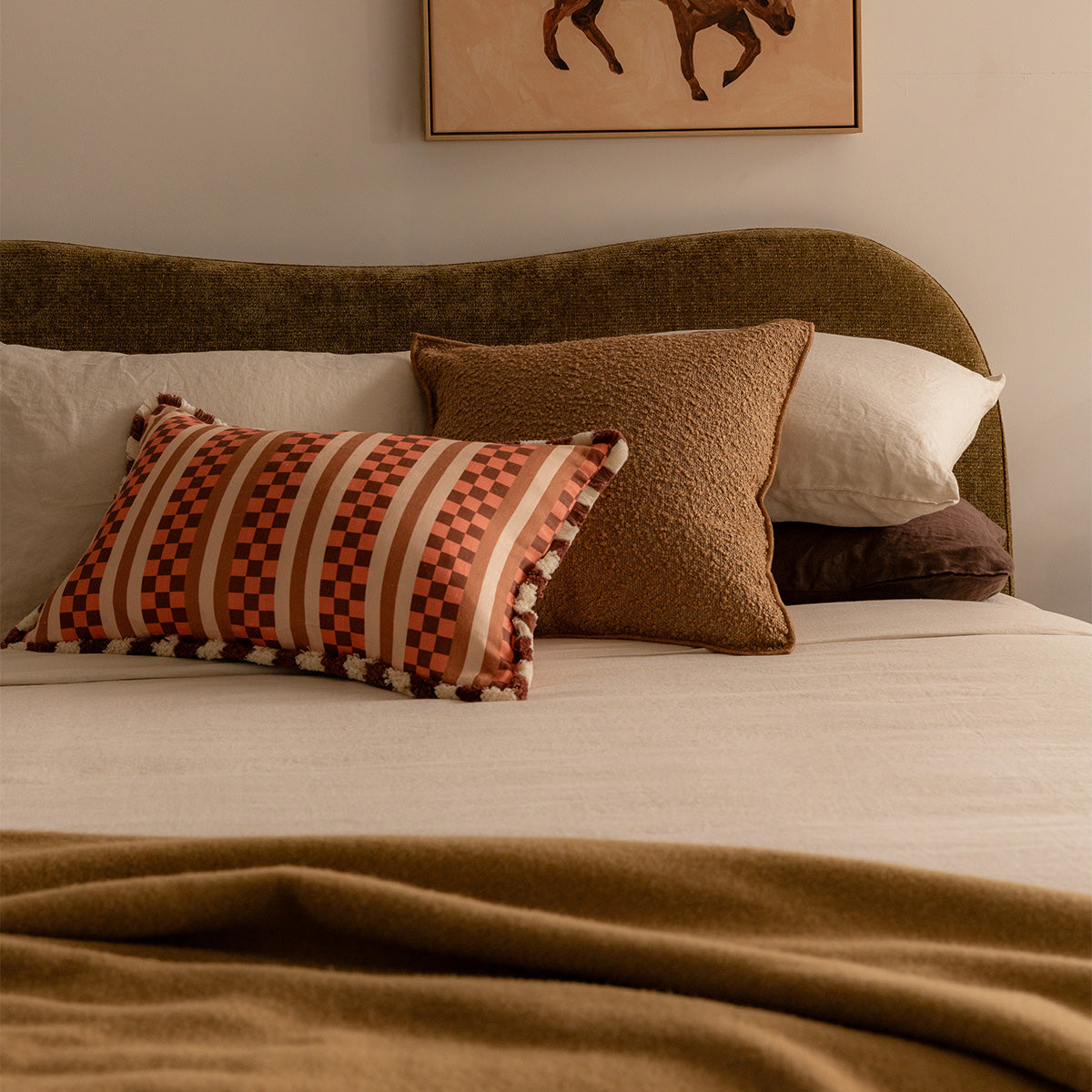 King bed with cushioned upholstery with a curved bed head and short, rubber wood legs.