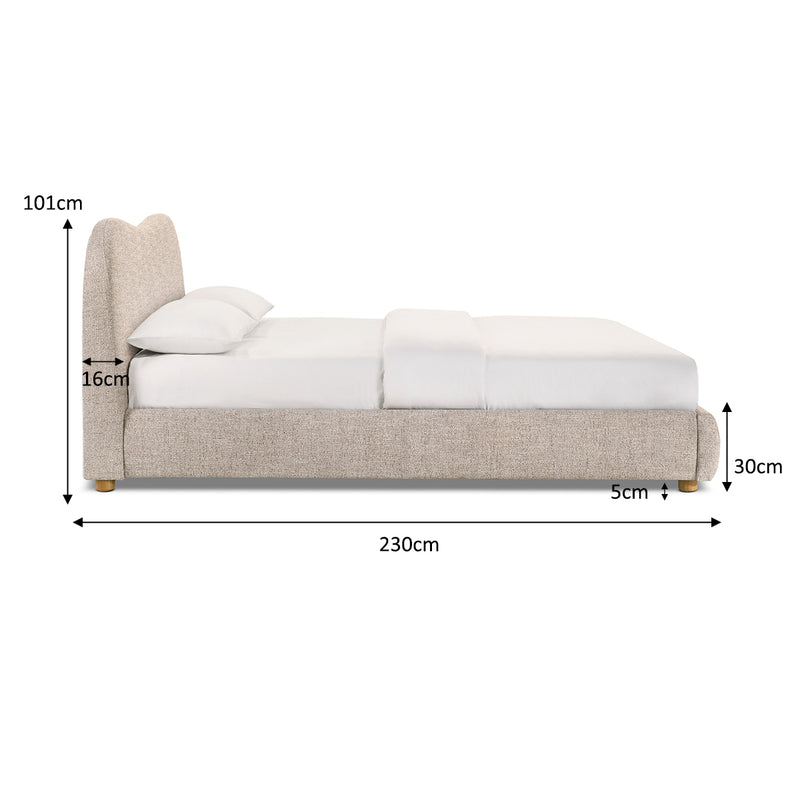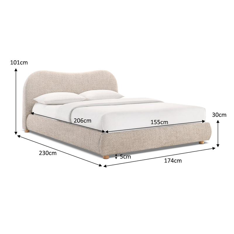 Queen bed with complete cream boucle, cushioned upholstery with a curved bed head and short, rubber wood legs.