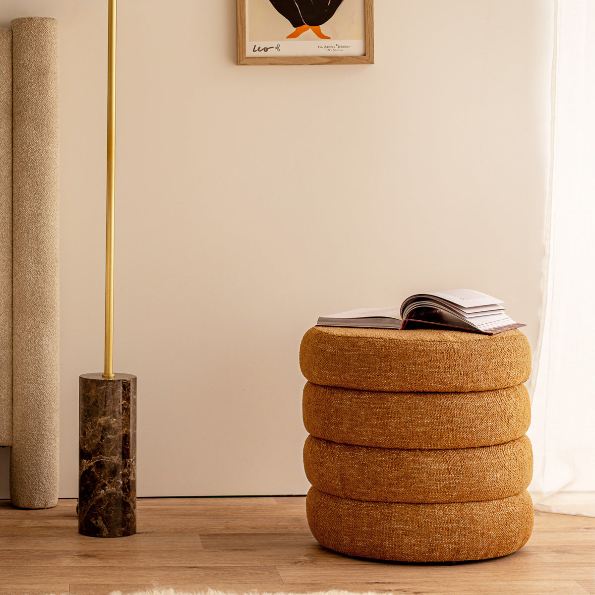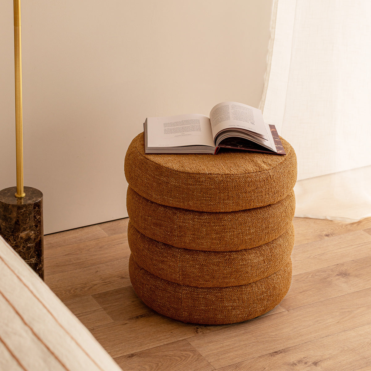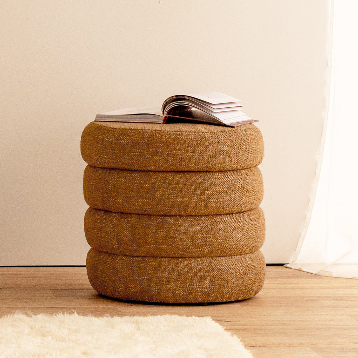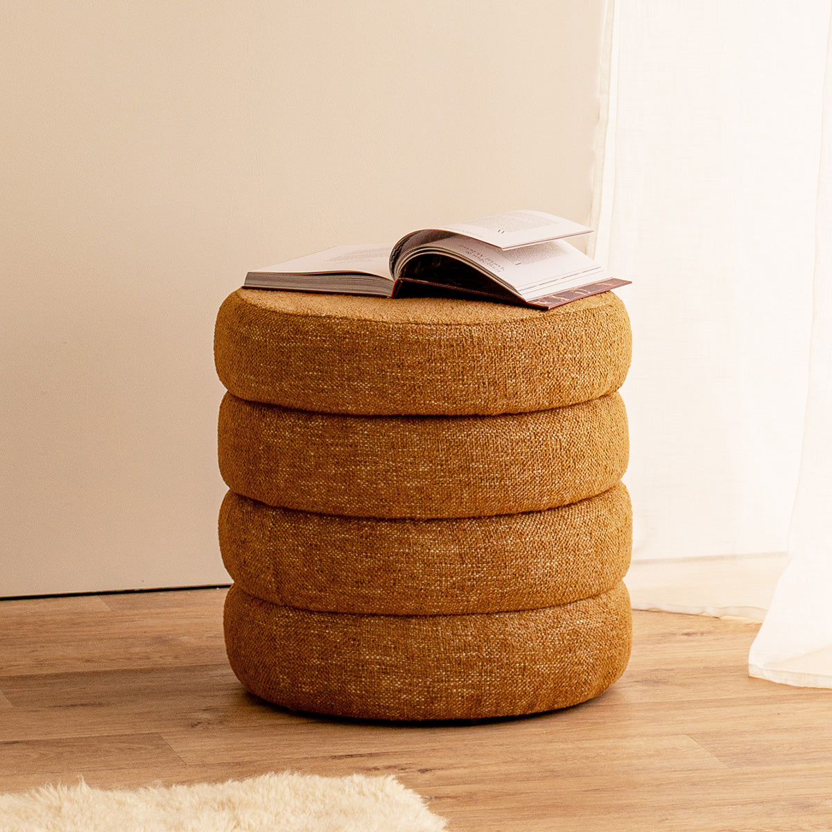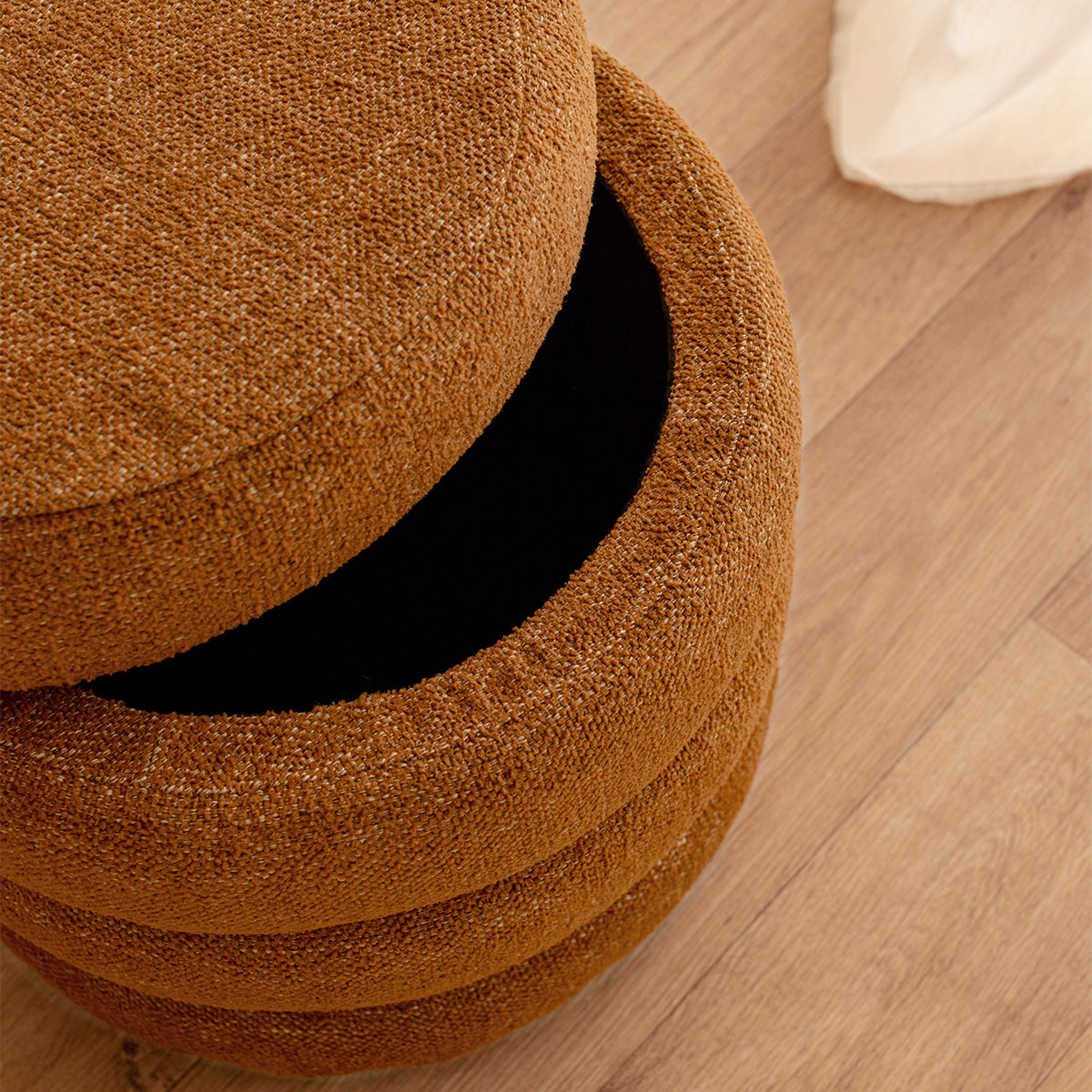 Boucle upholstery, removable top, storage capabilities, available in various colourways.