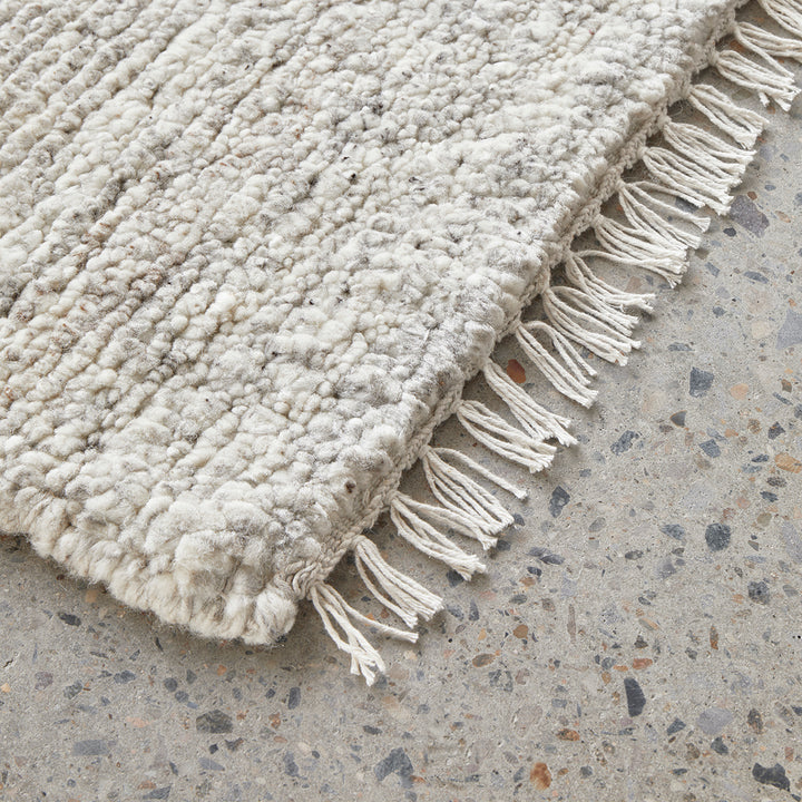 Soft 15mm pile, hand-knotted, 100% wool, delicate cotton fringe, made in India, use of an anti-slip pad underneath is recommended.
