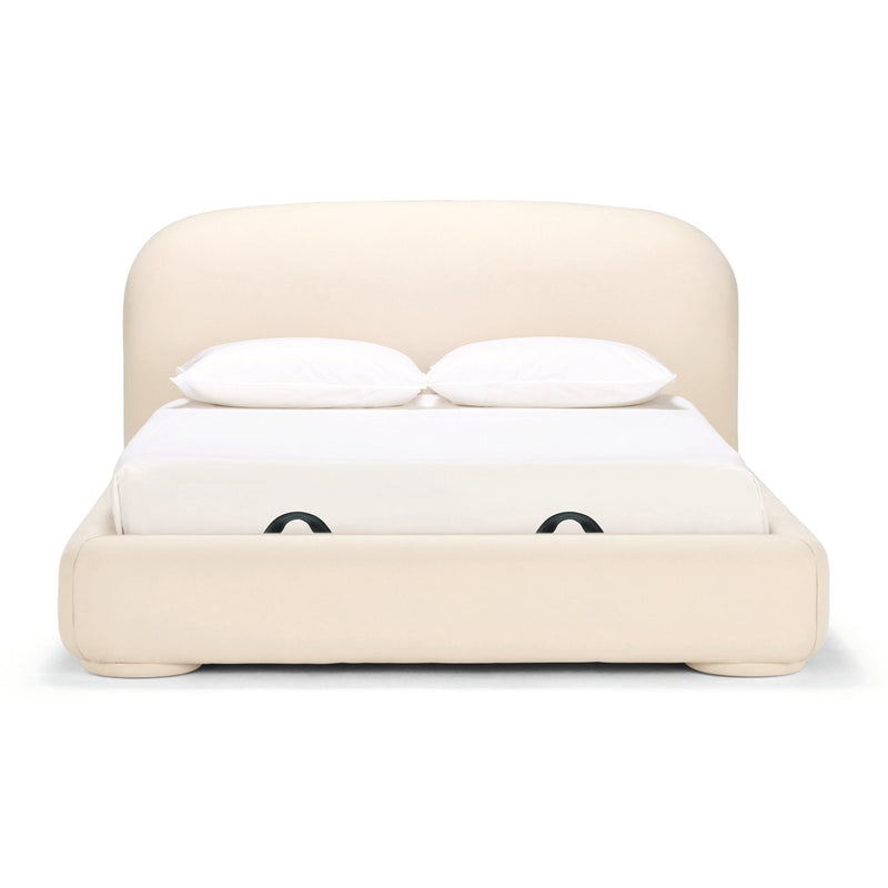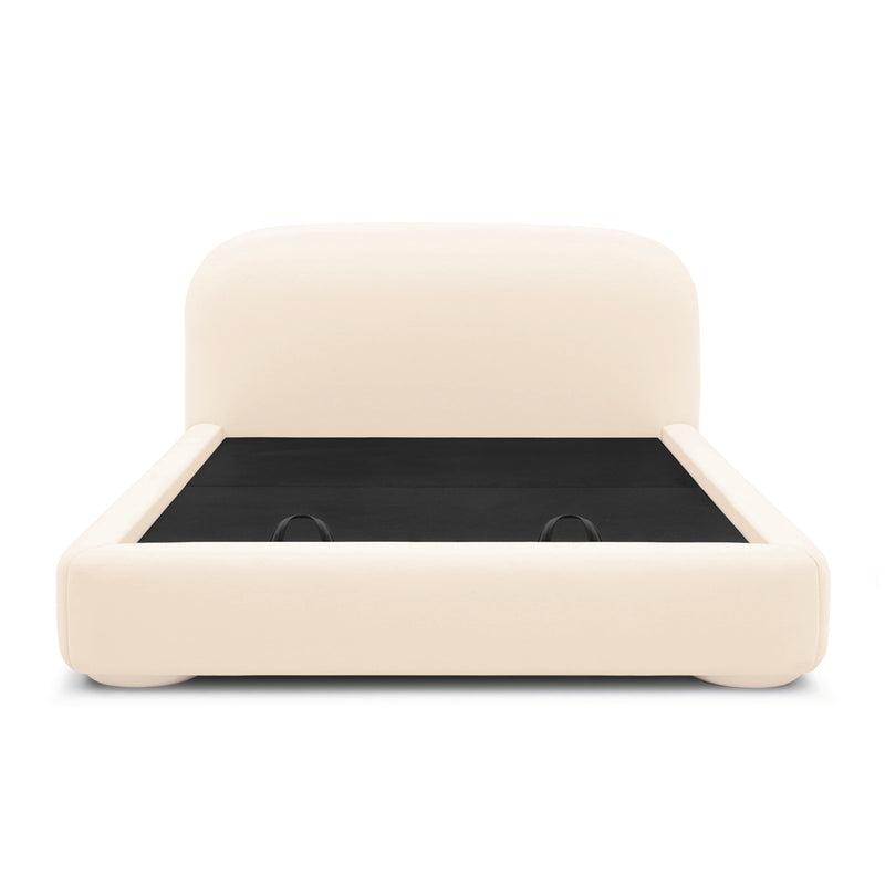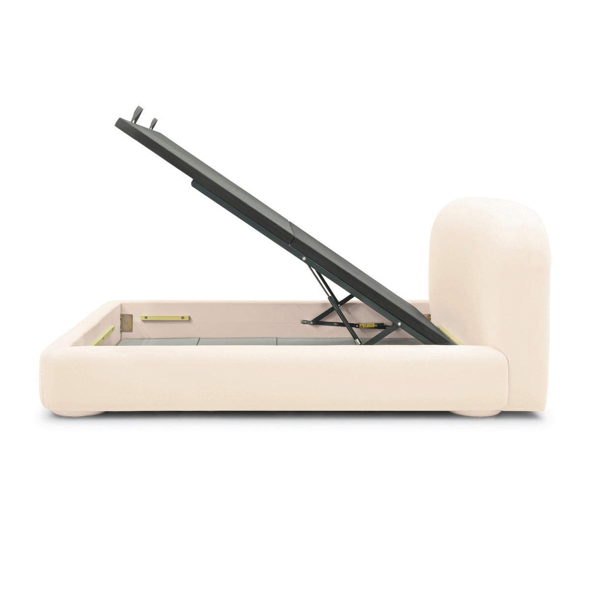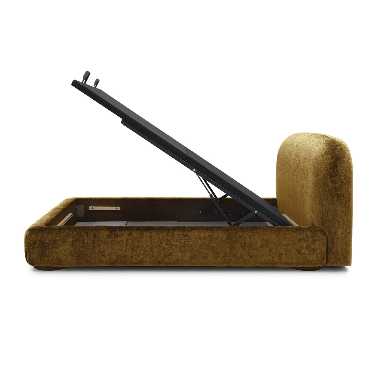 Designed by Sarah Ellison for ELLISON STUDIOS., available in queen & king size, gas lift storage, kiln-dried solid and engineered wood frame, solid timber slats, available in various finishes.