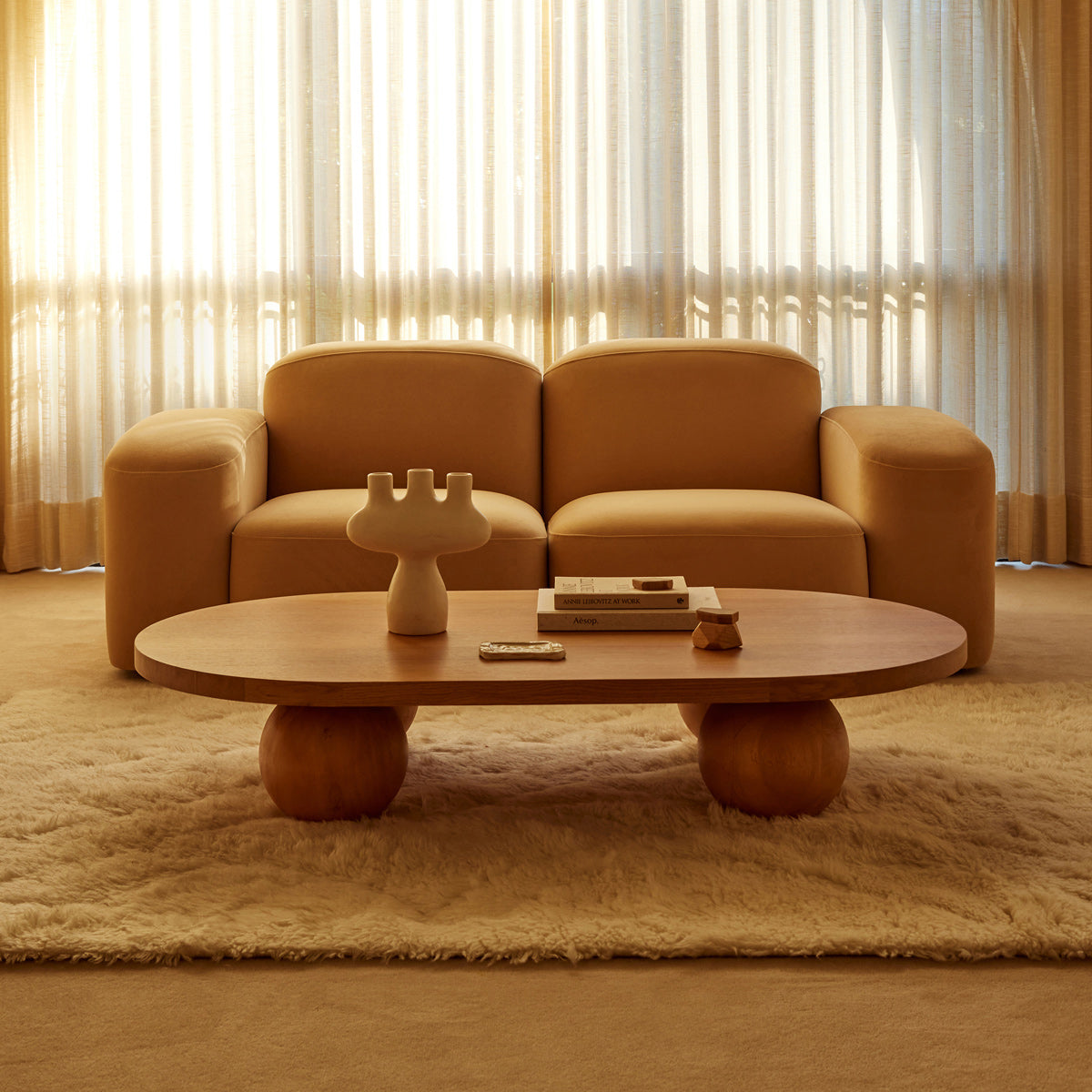 Designed by Sarah Ellison for ELLISON STUDIOS., 2 seater, seat and cushions are made with high-resiliency foams and high-gauge sinuous springs, available in various colourways.