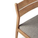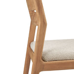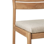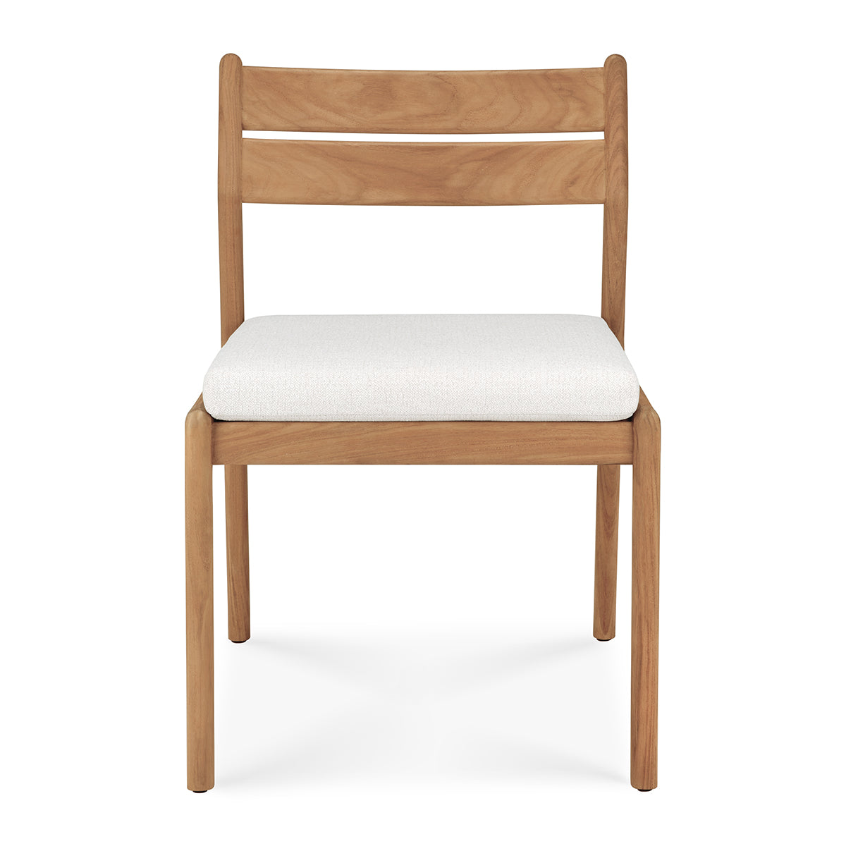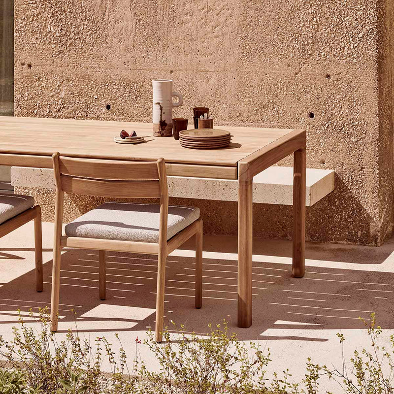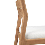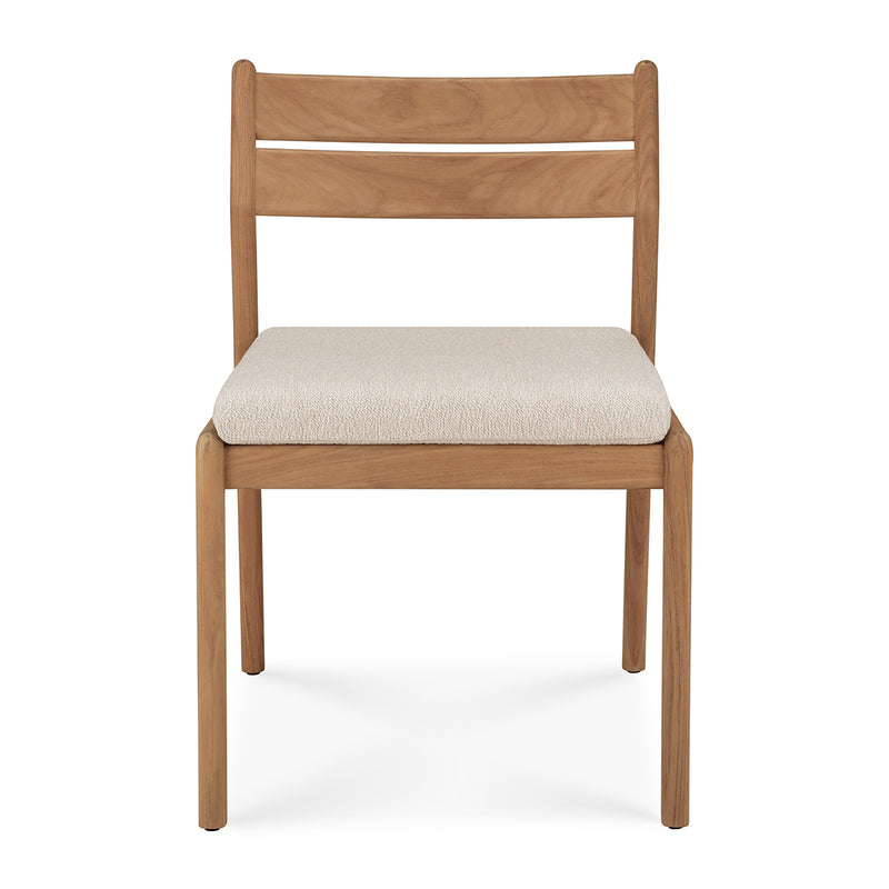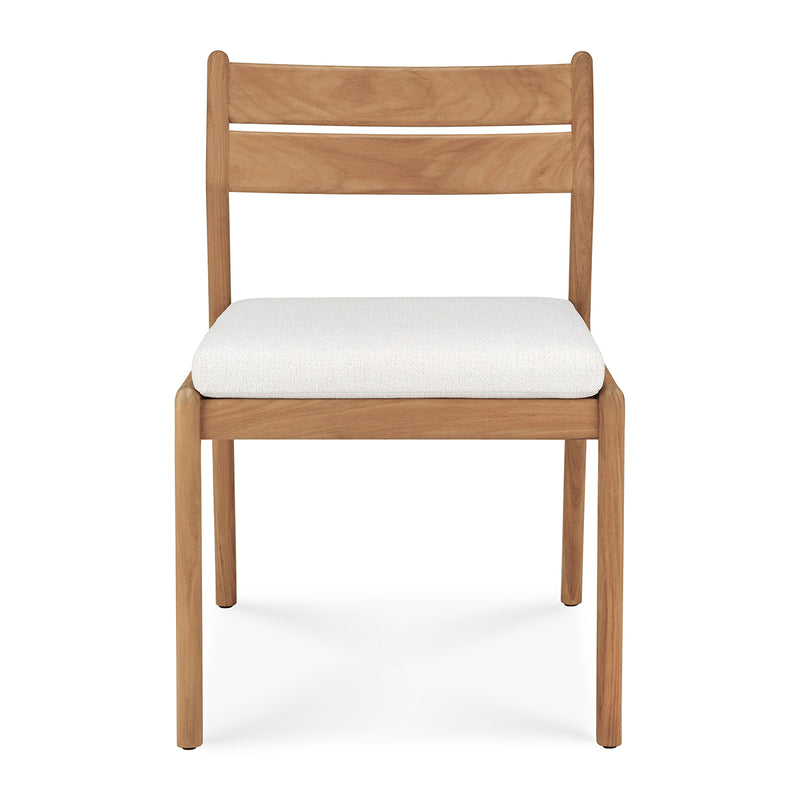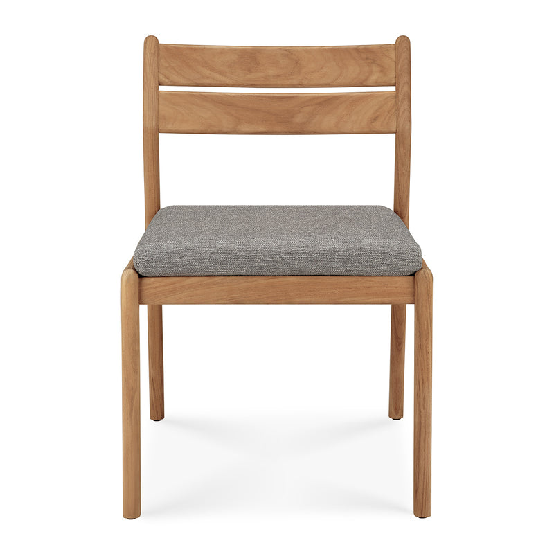 Crafted from solid teak, the Jack Outdoor Dining Chair balances durability with effortless style. Its clean-lined frame showcases a gently curved backrest for support, while the plush, weather-resistant cushion ensures comfort. Designed for both alfresco and indoor settings, this chair's natural finish enhances its organic appeal. Subtle detailing and a minimalist silhouette make it a versatile addition to any dining space. Pair it with a teak table for a cohesive, timeless outdoor setup.