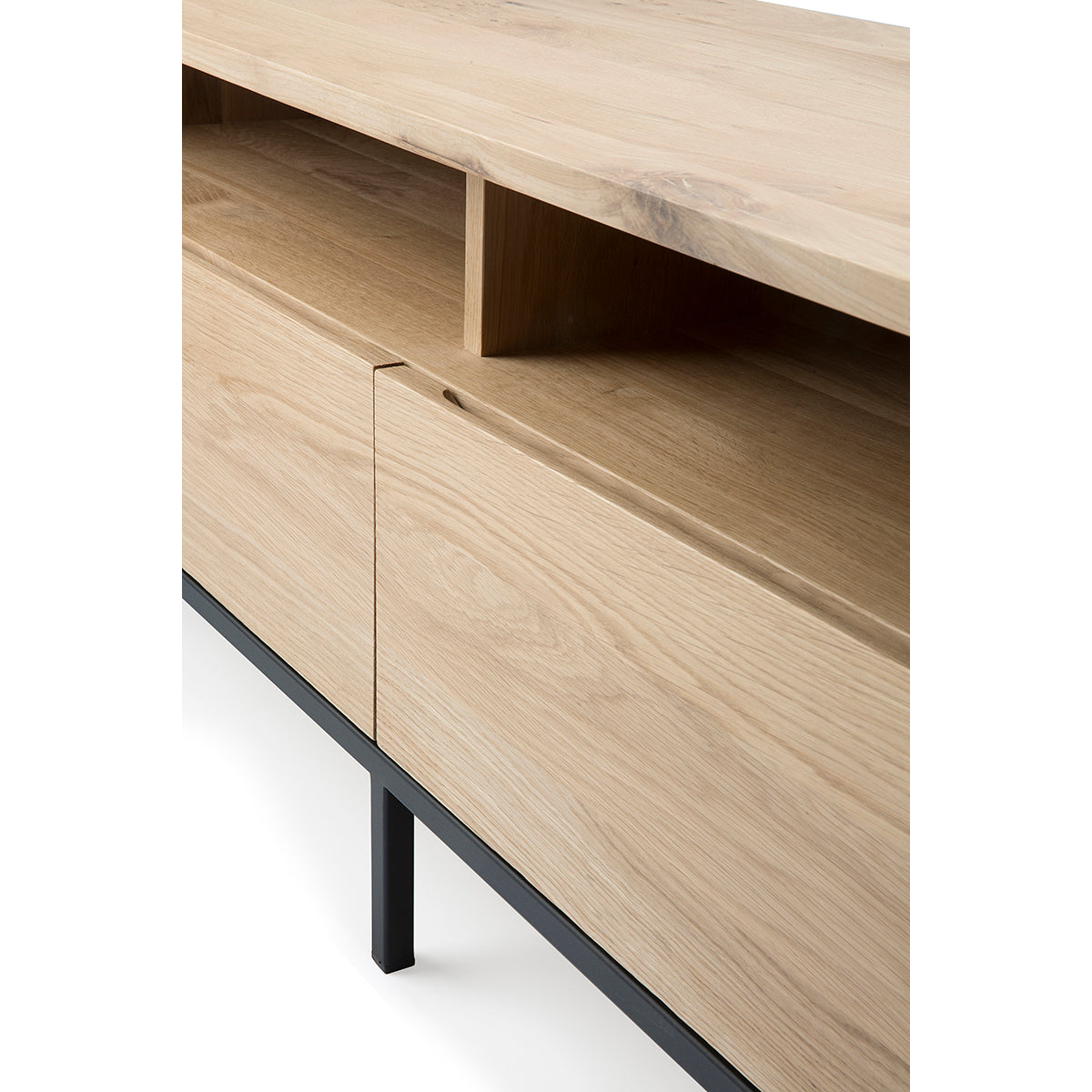 A clean and pure look with black metal legs, the Ligna TV cupboard in solid oak offers a perfect storage facility for the living room.