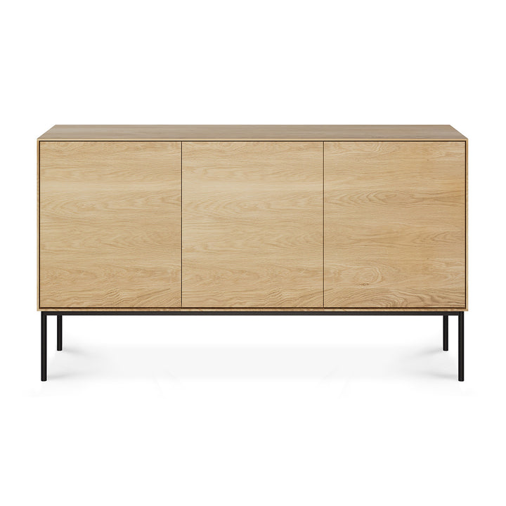 This Whitebird sideboard features 3 push open doors. Made from solid oak with a varnish finish and black metal legs.