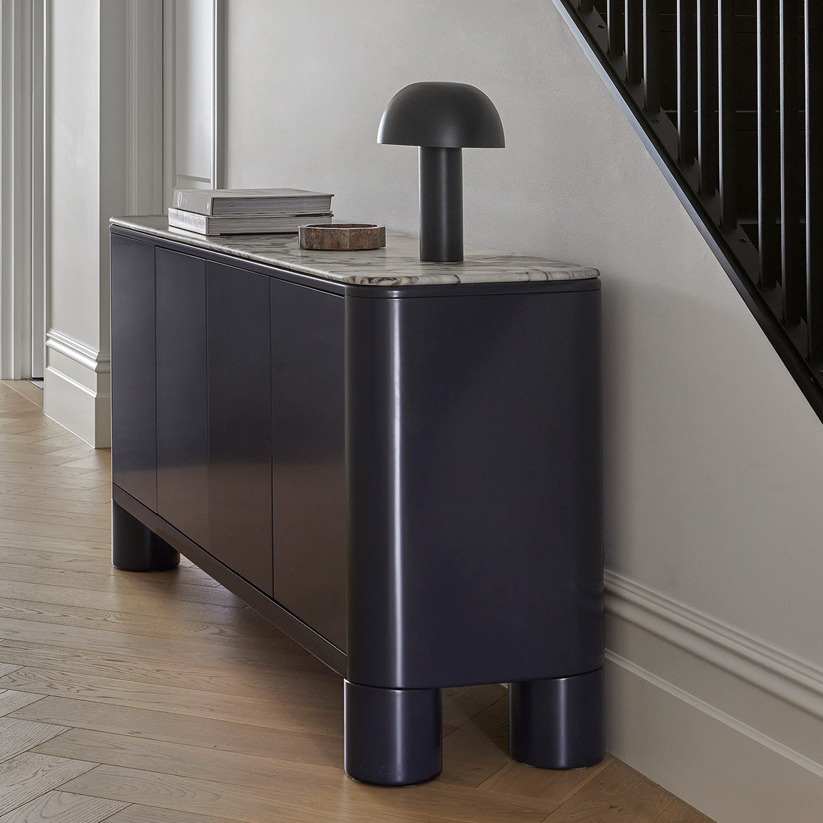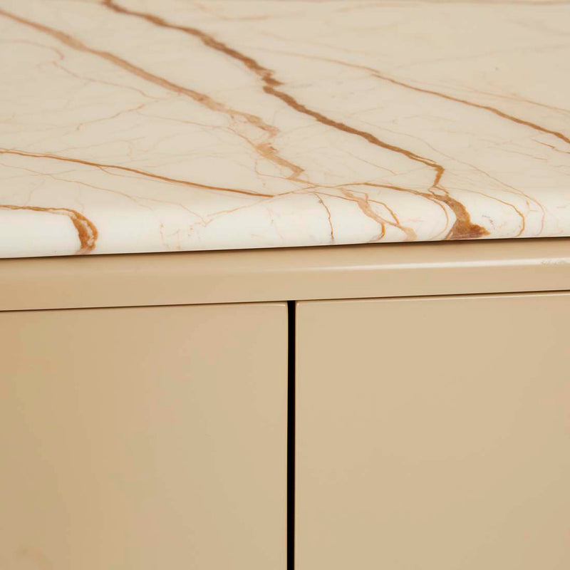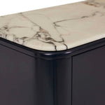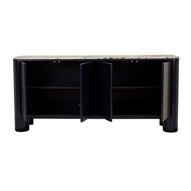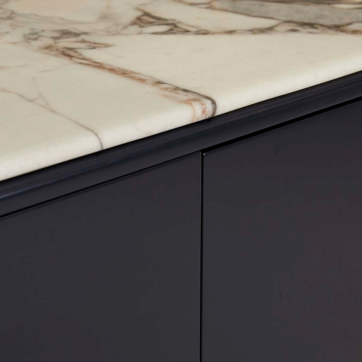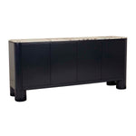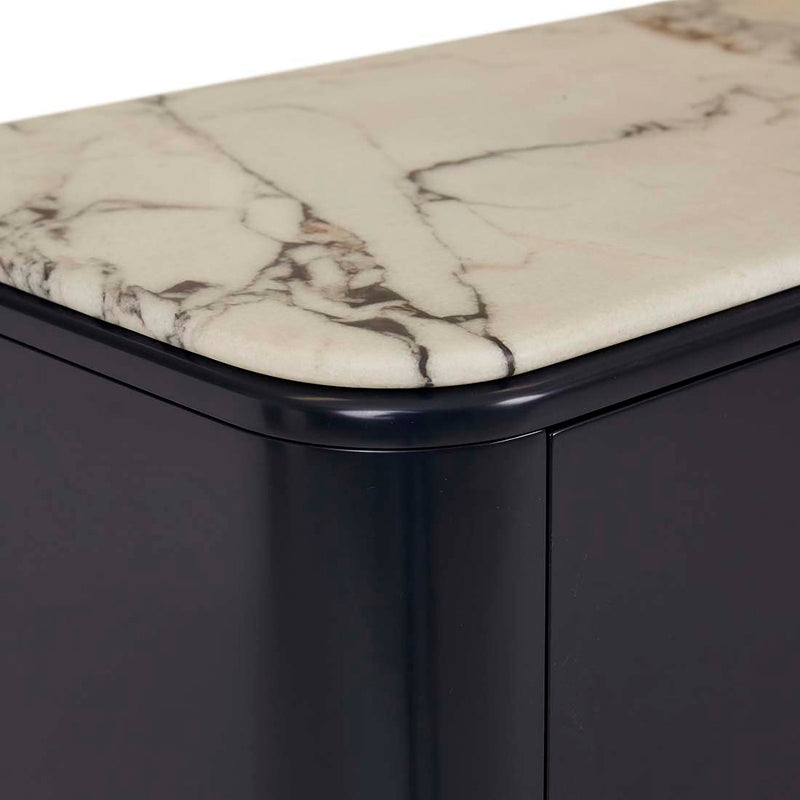 Add a touch of sophistication to your dining space with the Frankie Marble Buffet in Matt Ocean Marble and Gloss Navy. Its mixed material design, featuring a marble top and painted base, creates a striking visual appeal. Hettich hardware guarantees functionality, while ample storage space ensures practicality. Ideal for modern interiors, this buffet blends elegance with practical features.