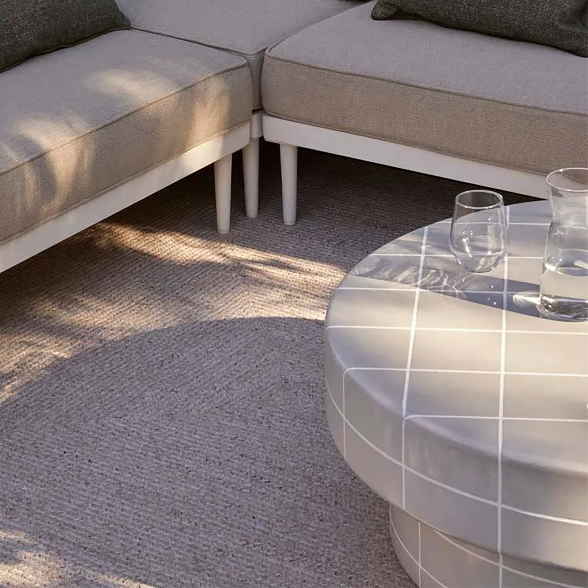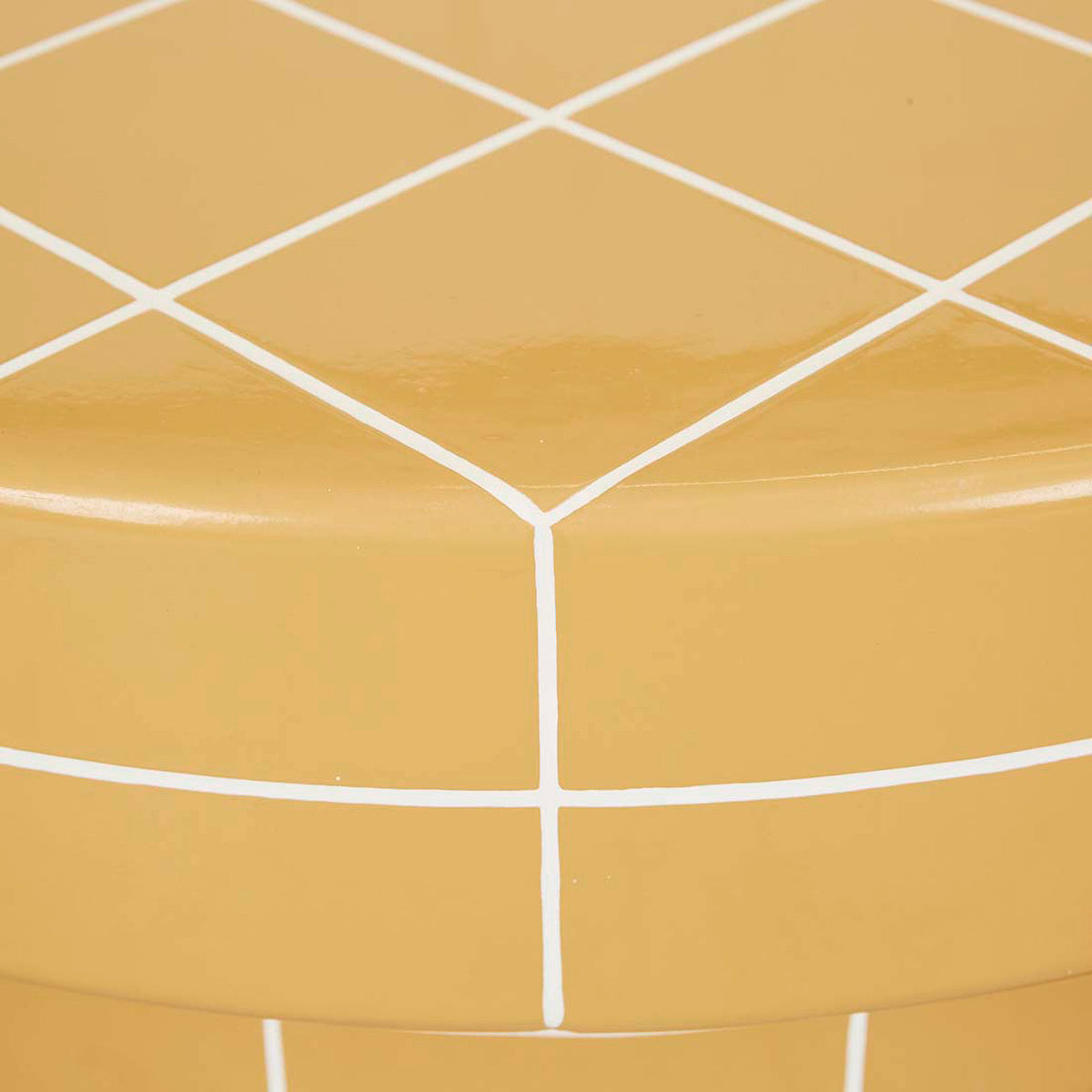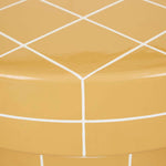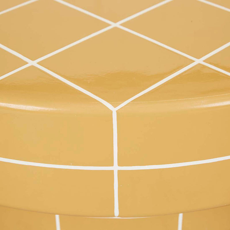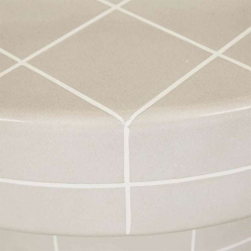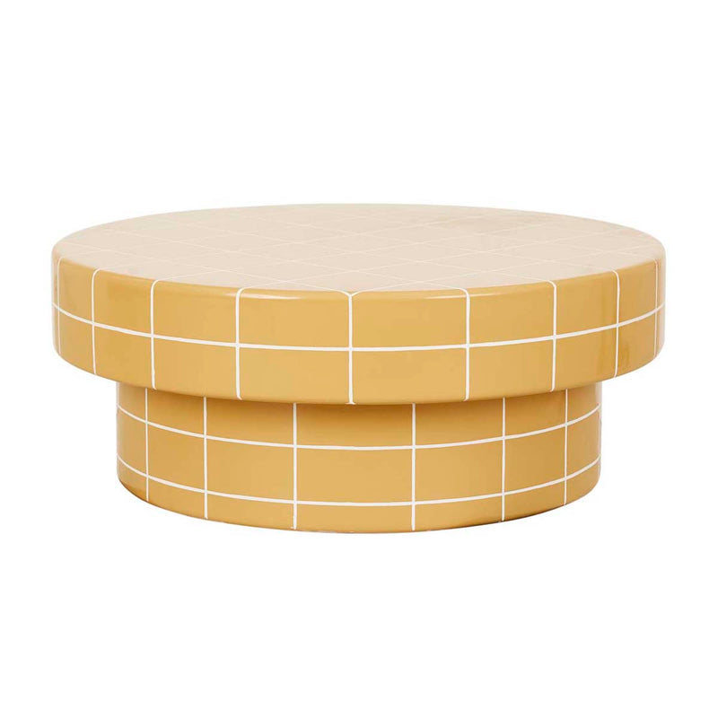Designed to function as a bold coffee table or decorative statement piece, striking circular silhouette with a tiled grid pattern, available in two colours.