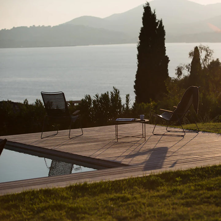 Powder coated metal for outdoor use with PP plastic lamellas and bamboo armrests.
