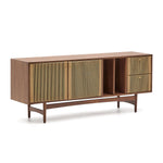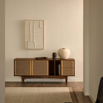 Open storage space with vertical divider and adjustable feet, 3 doors and 2 drawers with concealed runners and soft closing system.