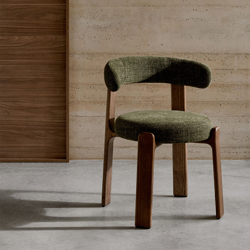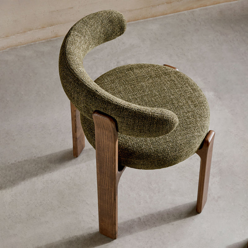 The Granite Dining Chair combines sculptural form with everyday functionality. Featuring a curved, cushioned backrest and a rounded seat, it provides both comfort and support. The solid timber frame adds warmth and durability, while the soft upholstered finish enhances its inviting appeal. Its refined silhouette makes it a standout piece, ideal for contemporary or classic interiors. Whether placed around a dining table or used as an occasional chair, the Granite Dining Chair brings effortless sophistication to any setting.