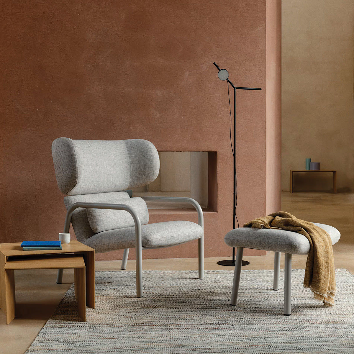 Fabric upholstery, powder-coated steel frame, available in various colourways.