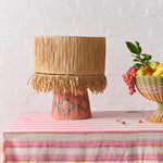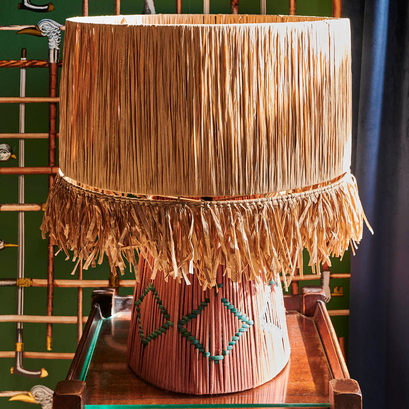 Rafia base with diamond design, fringed edge detail.