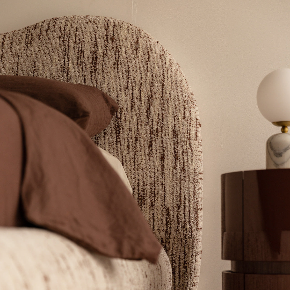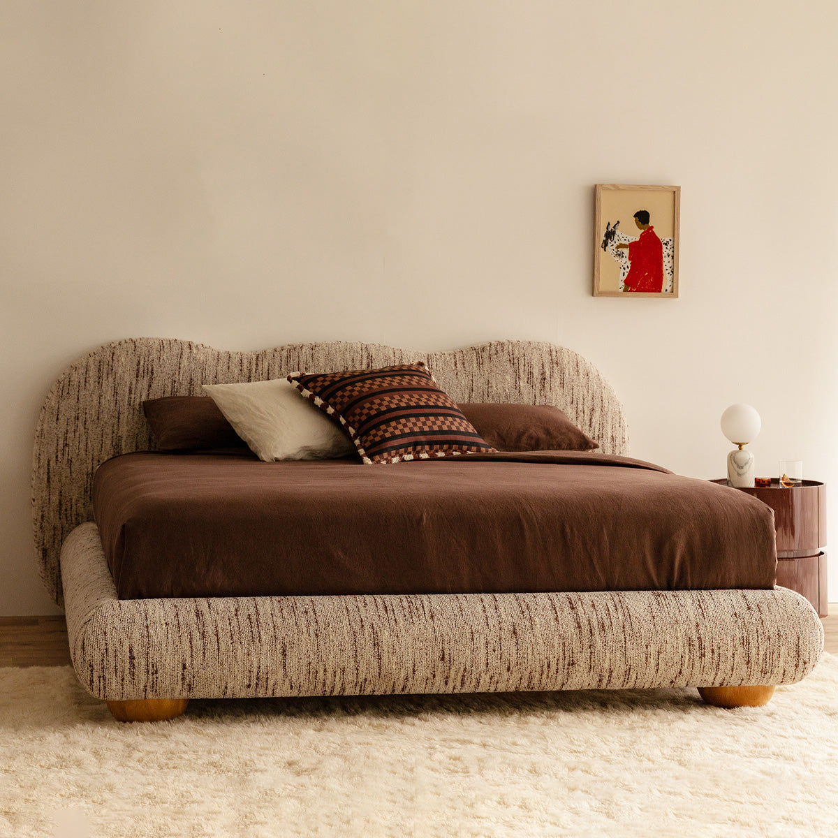 Boucle upholstery, spherical wooden feet, wavy bedhead, slats included, available in D, K & Q sizes.