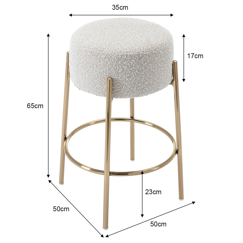 Round, boucle upholstered seat with a brushed gold or matte black steel base and curved foot rest.