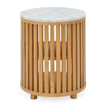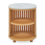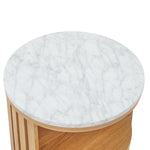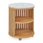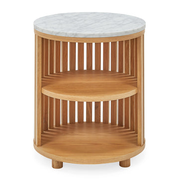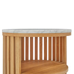 The Atlanta Marble Bedside Table showcases a refined silhouette with curved timber slats and a softly rounded form. Its warm oak base is paired with a striking yellow travertine top, bringing contrast and sophistication to any bedroom. Designed with open shelving for decorative styling or easy storage, this piece brings texture and tone into balance. Perfect for creating a styled moment beside your bed while keeping essentials within reach.