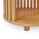 Solid oak timber base with vertical slatted detailing, open shelf for decorative display or practical storage.