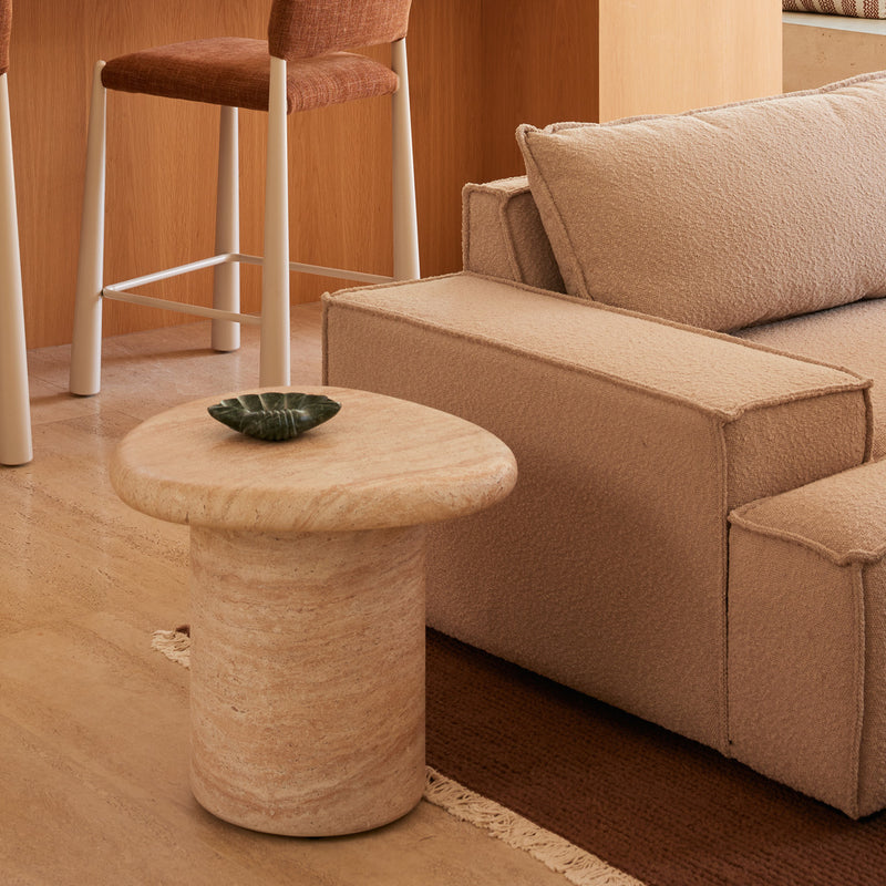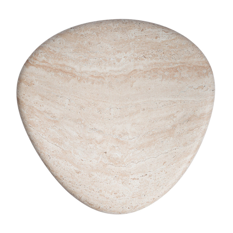 Suitable for indoor & covered outdoor use, organic shape, concrete & reinforced fibreglass construction, travertine transfer film, pair with matching coffee table.