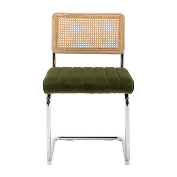 Solid steel frame, velvet upholstered seat, natural cane backrest.