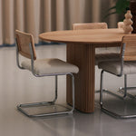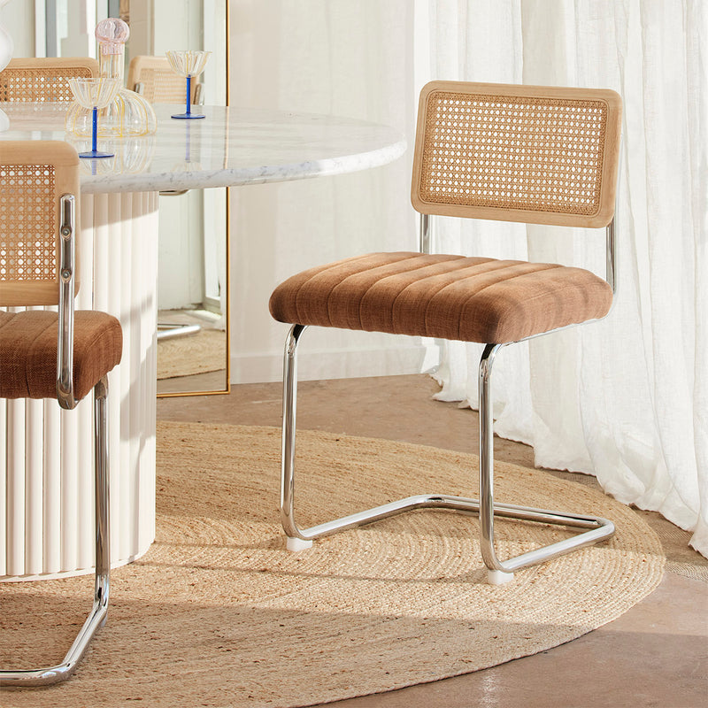 The Blake Rattan Fabric Dining Chair combines modern aesthetics and luxurious comfort to make a strong design statement in any dining space. Crafted from solid steel, the frame features a stunning cantilever structure that brings a unique focal point of visual interest to its design. The contrasting materials of the natural rattan backrest and soft fabric seat create a beautiful interplay of textures, whilst offering supreme support with plush foam padding. The tactile and visually appealing aesthetic of this chair will elevate your interiors, and last your home for years to come.