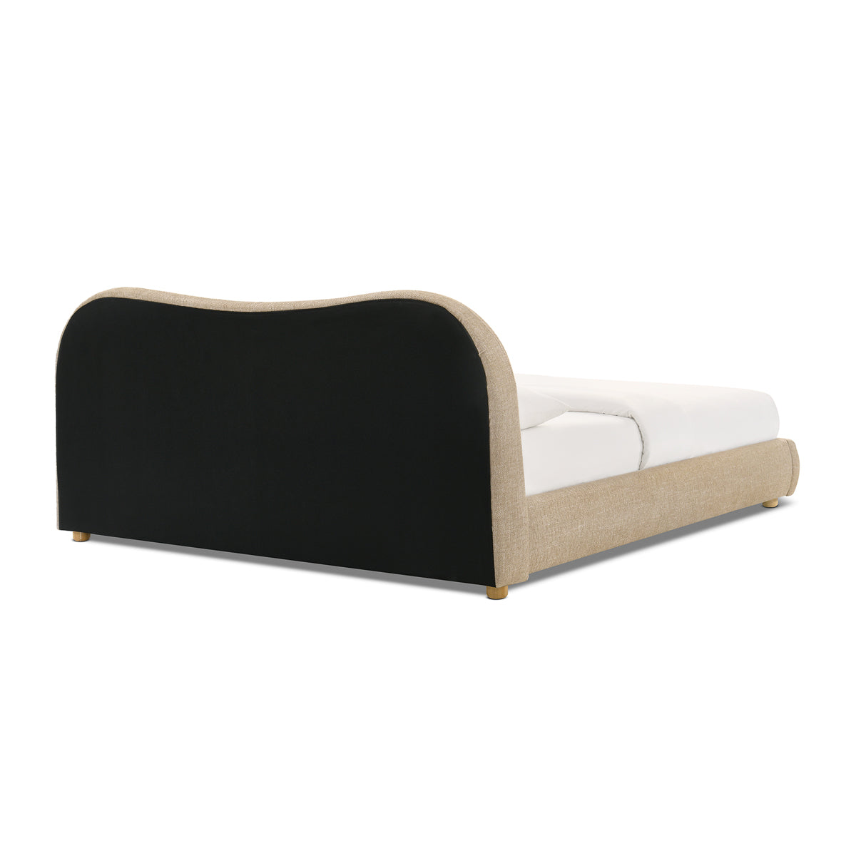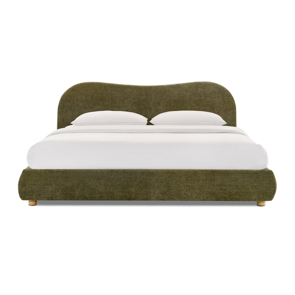 King Bed with complete cream boucle, cushioned upholstery with a curved bed head and short, rubber wood legs.