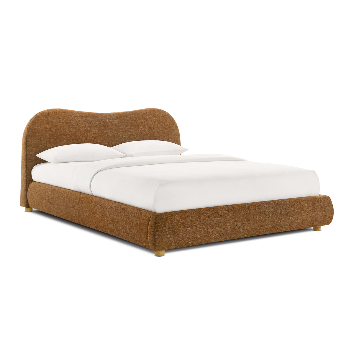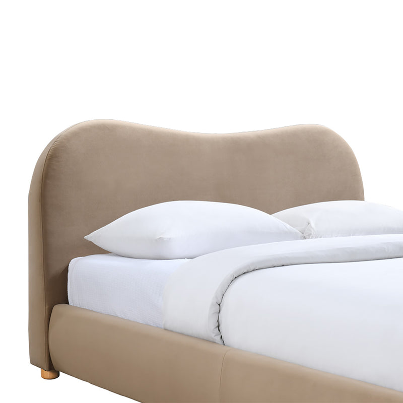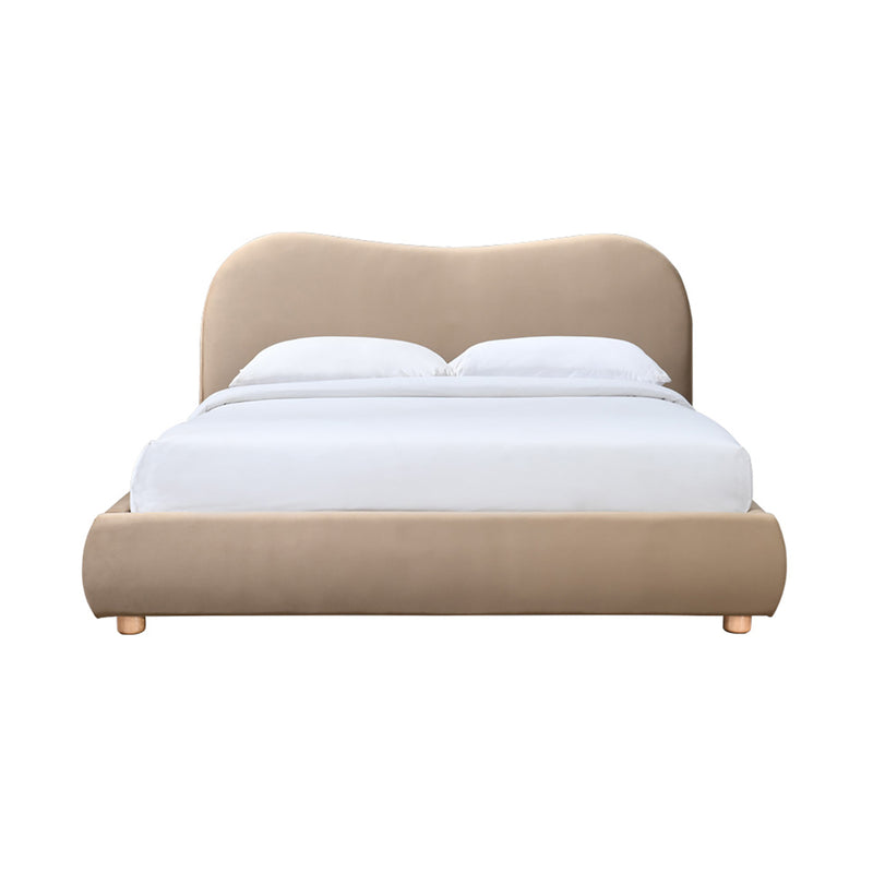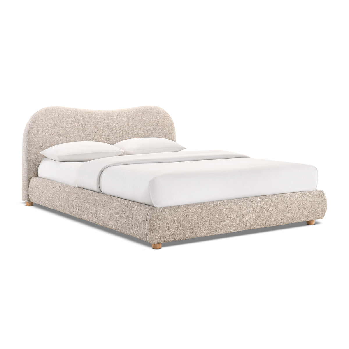Queen bed with cushioned upholstery with a curved bed head and short, rubber wood legs.