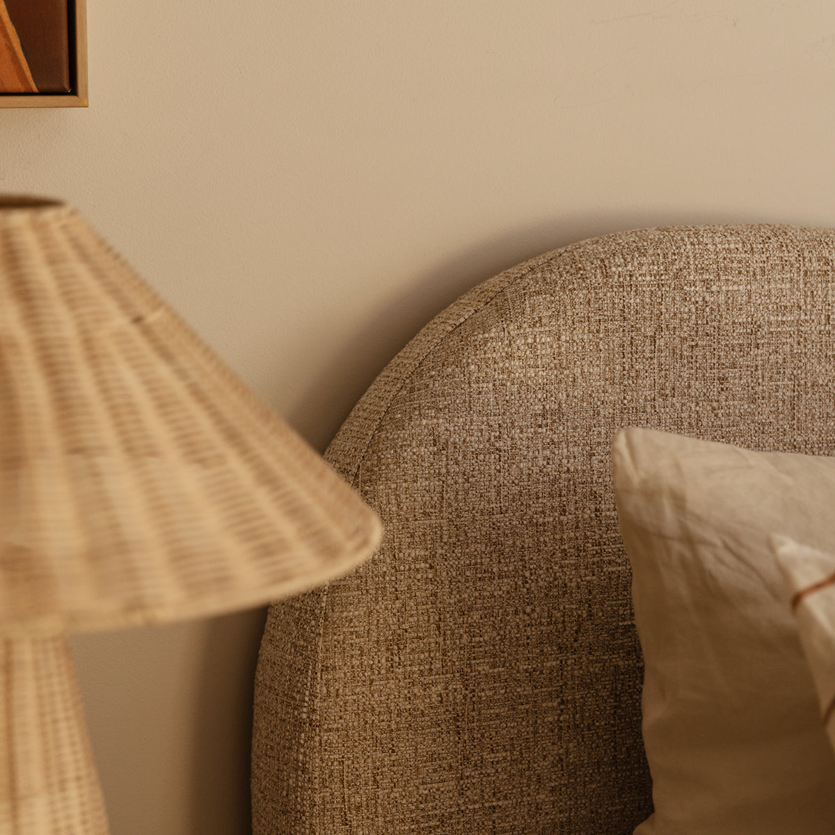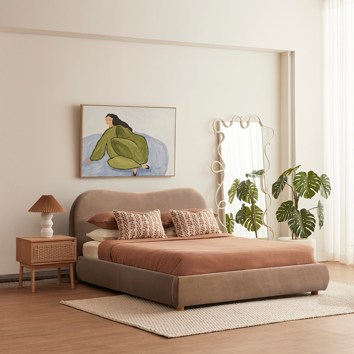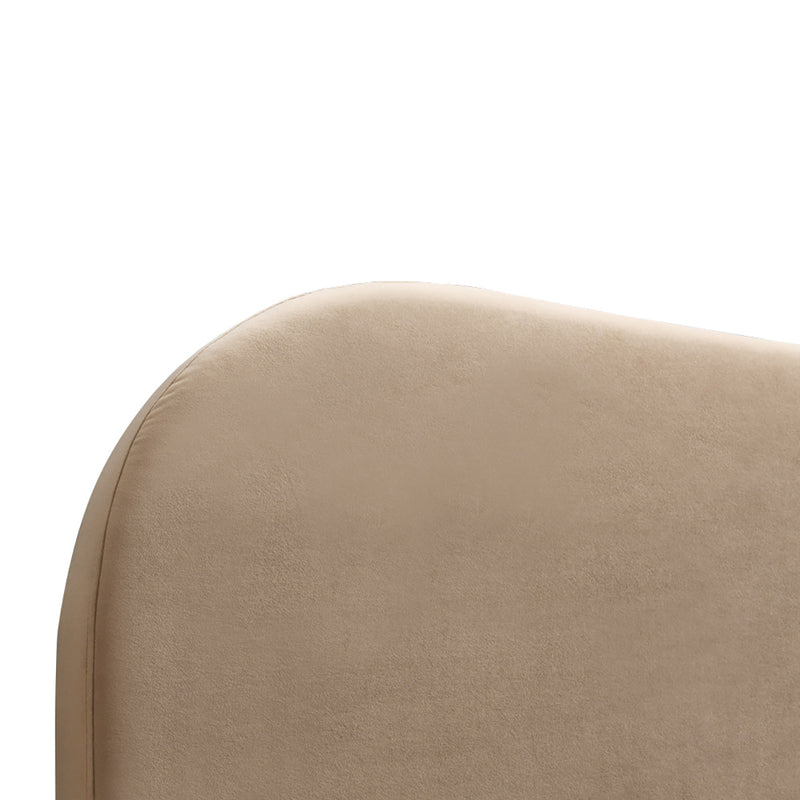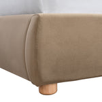 Queen bed with cushioned upholstery with a curved bed head and short, rubber wood legs.