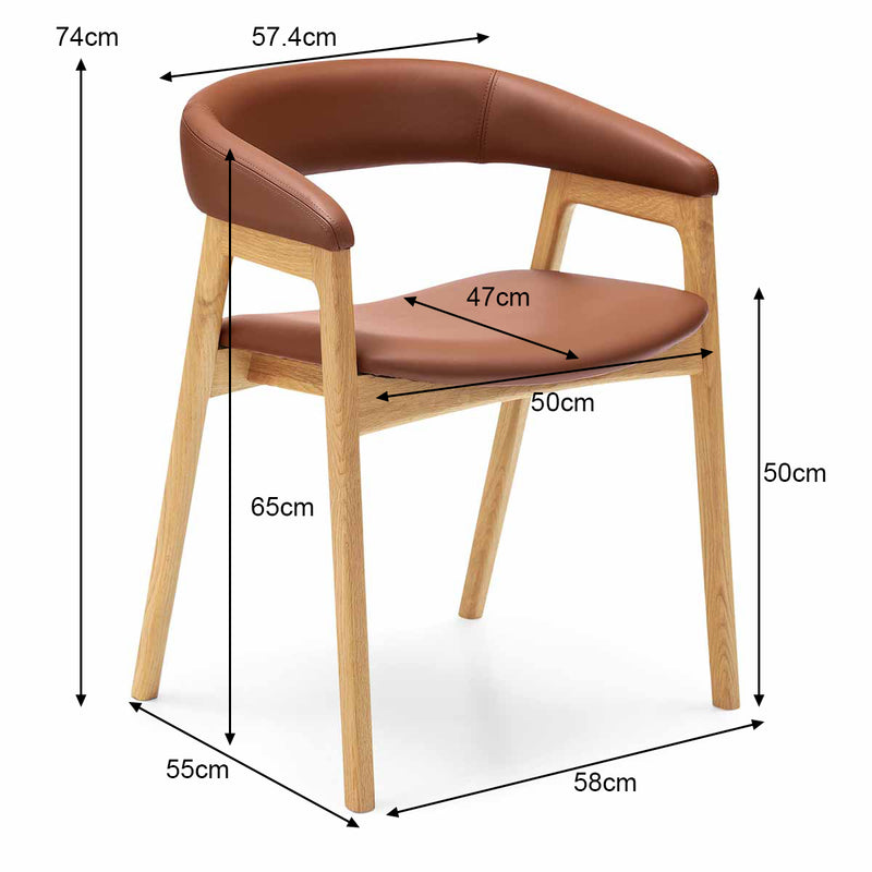Leather upholstery with a padded seat, armrests, and a curved back. Oiled, solid oak legs.