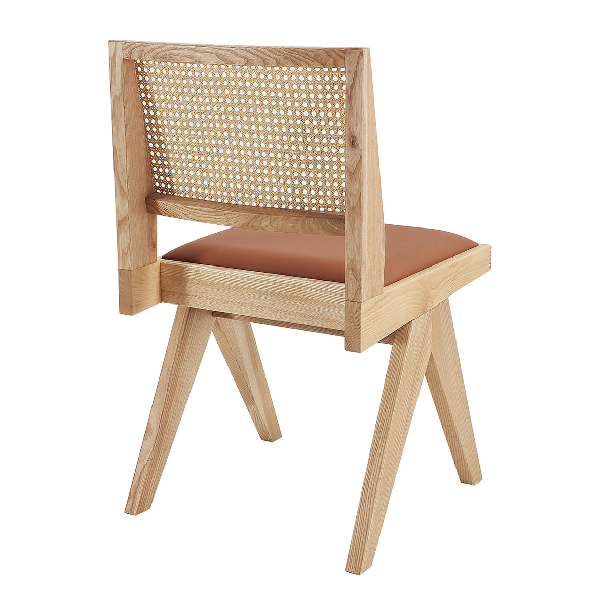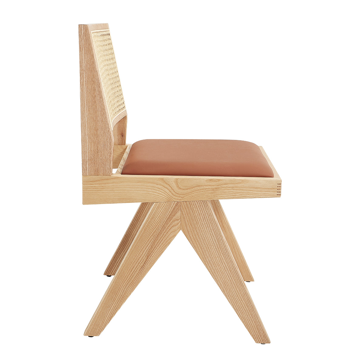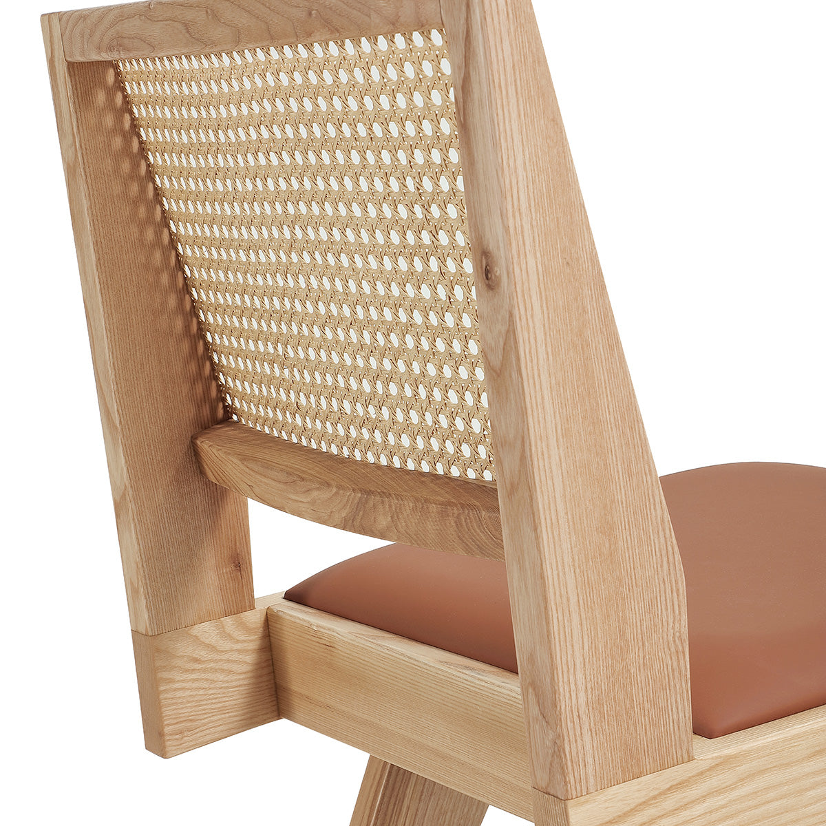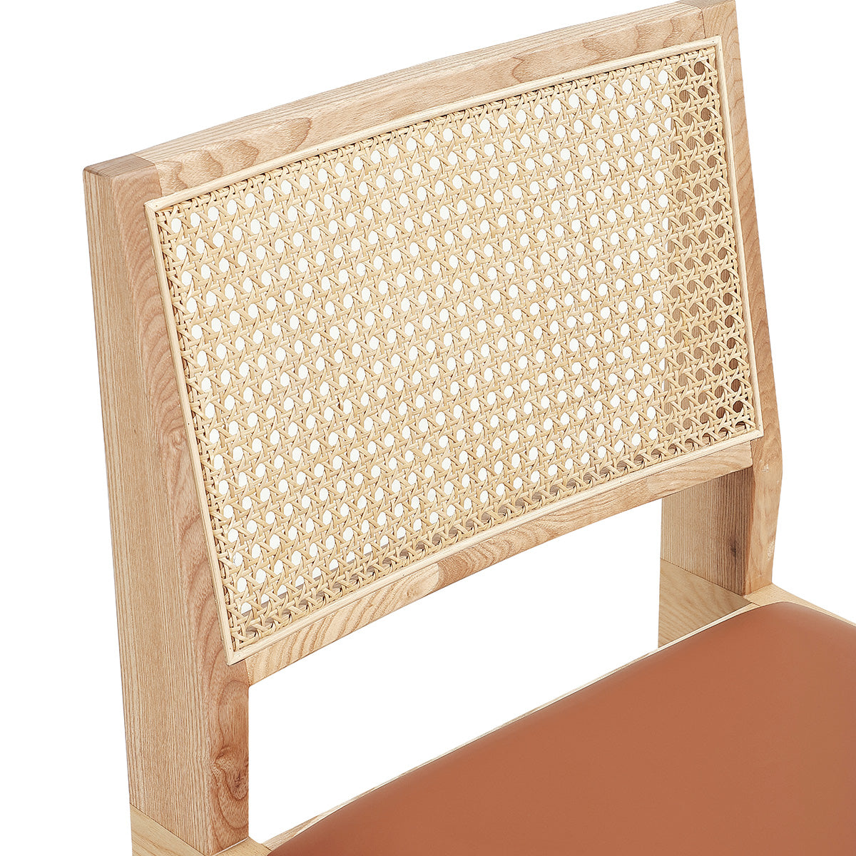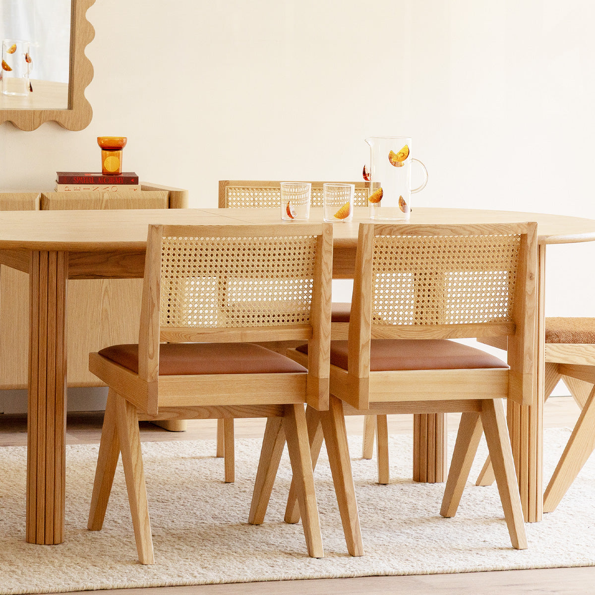 The Cuba Dining Chair is a contemporary classic with an angular form. Crafted from ash timber, it features gently tapered legs and a natural rattan backrest that brings an element of warmth and texture to its design. The leather upholstered seat enhances its visual interest and comfort, making it the perfect piece to accompany long dinners and relaxed entertaining.