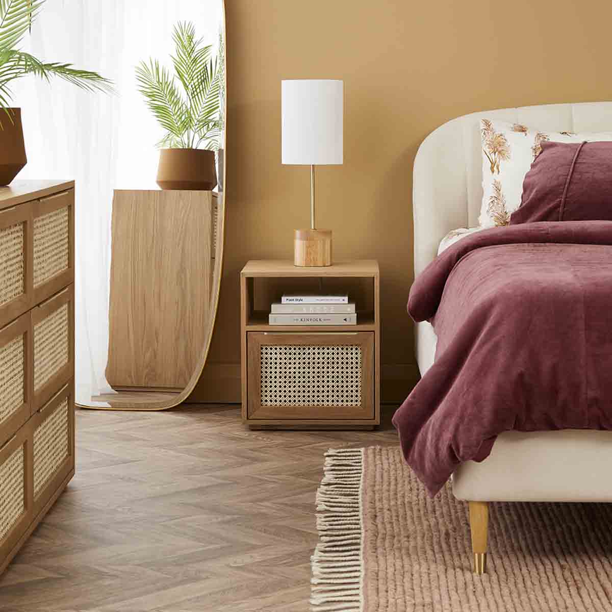 Solid timber construction, natural woven cane panelling, nook shelf, brass handles and push to open soft close drawer mechanism.
