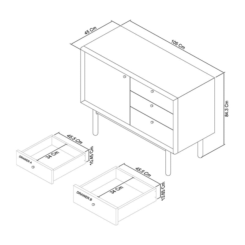 Solid timber construction, 1 cupboard, 3 drawers, adjustable and removable shelves, available in various sizes.