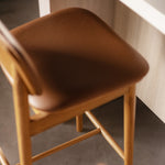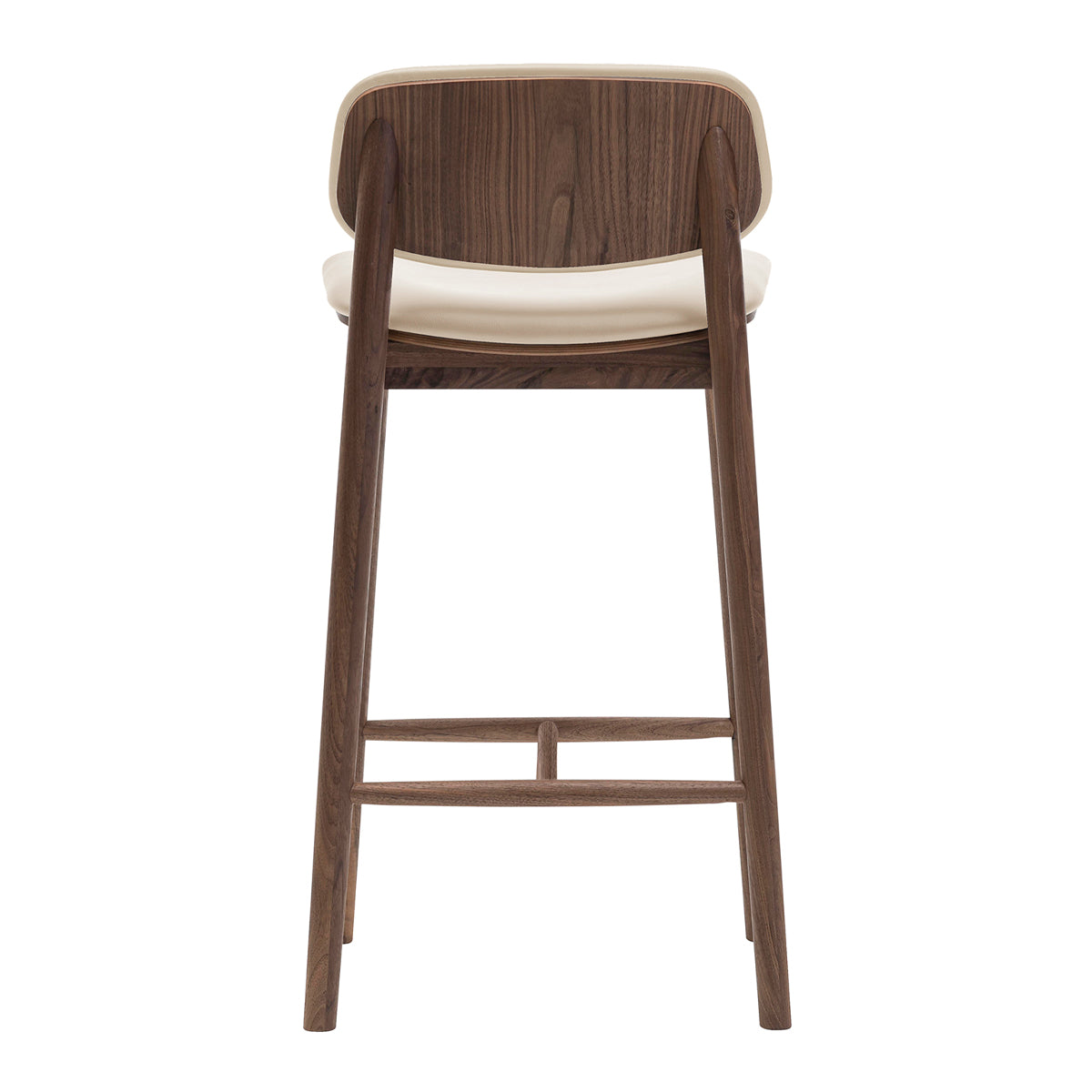The beautifully crafted solid timber base is sealed with lacquer to keep the finish looking pristine. Padded black leather seat and backrest, foot bar. Available in various options of timber and upholstery.
