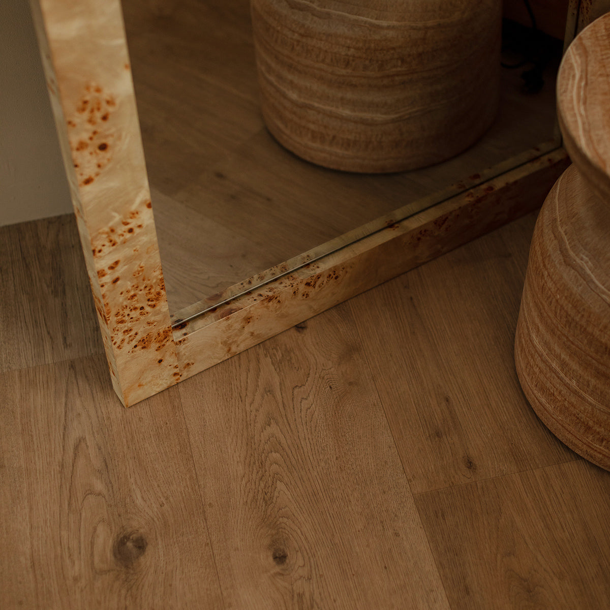 Oak veneer, Mirrored glass, engineered wood frame and backing, D-rings