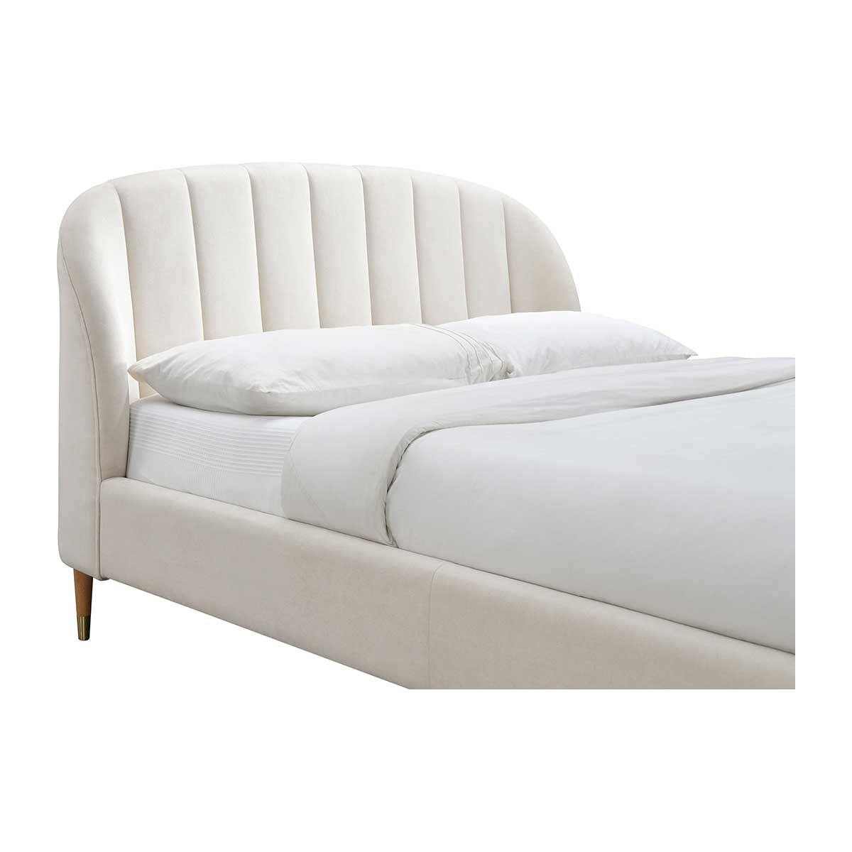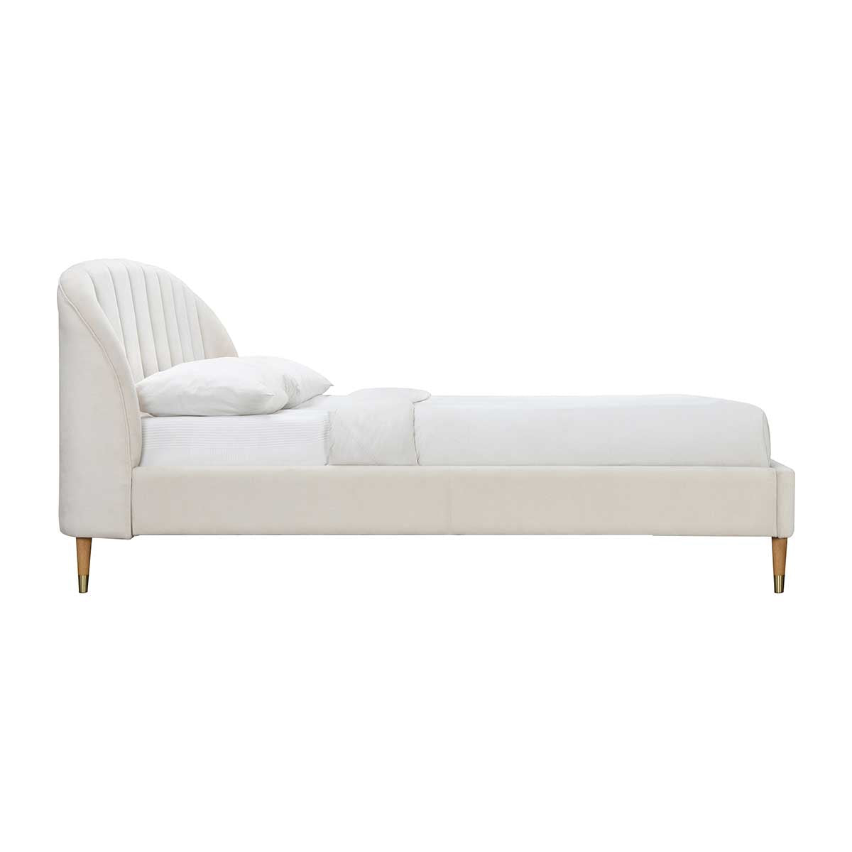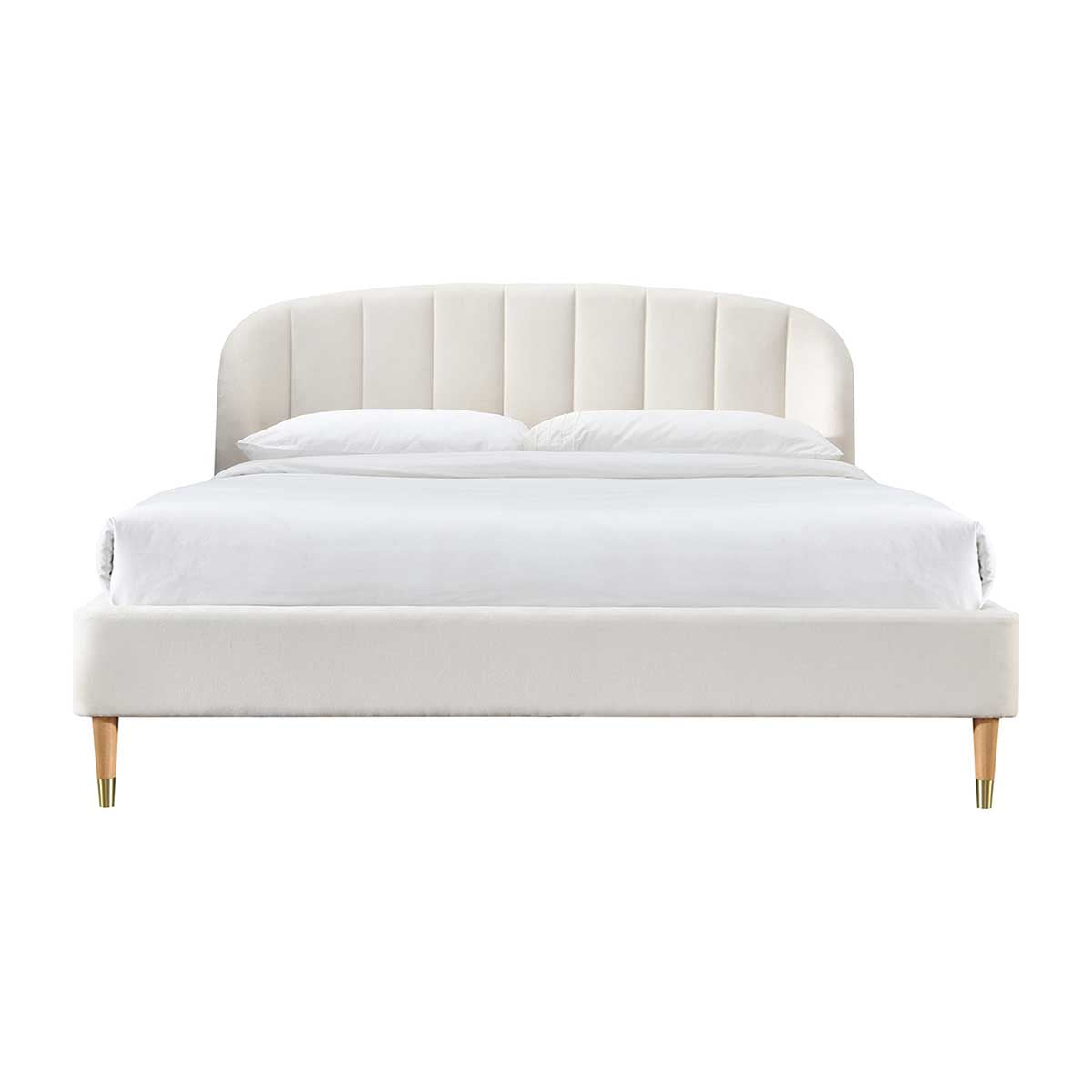 Luxe, classic design, pleat detailing, padded and upholstered bed head and frame, solid timber legs, brushed brass feet caps.