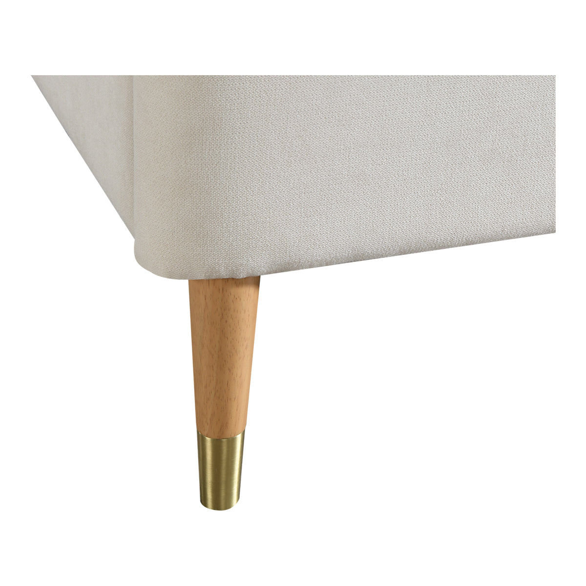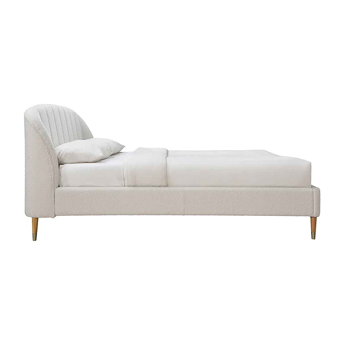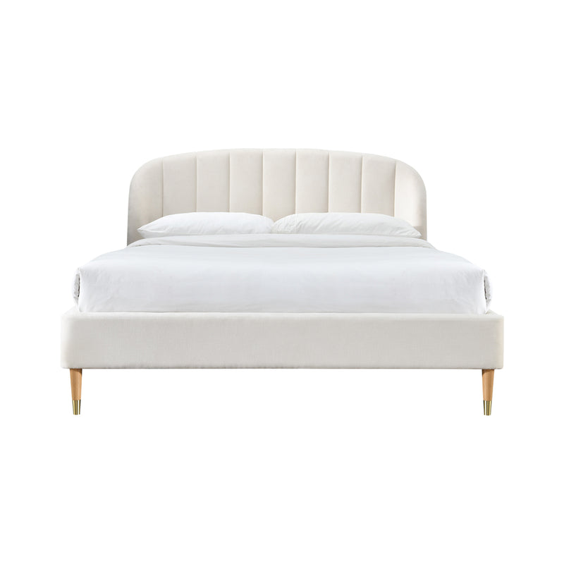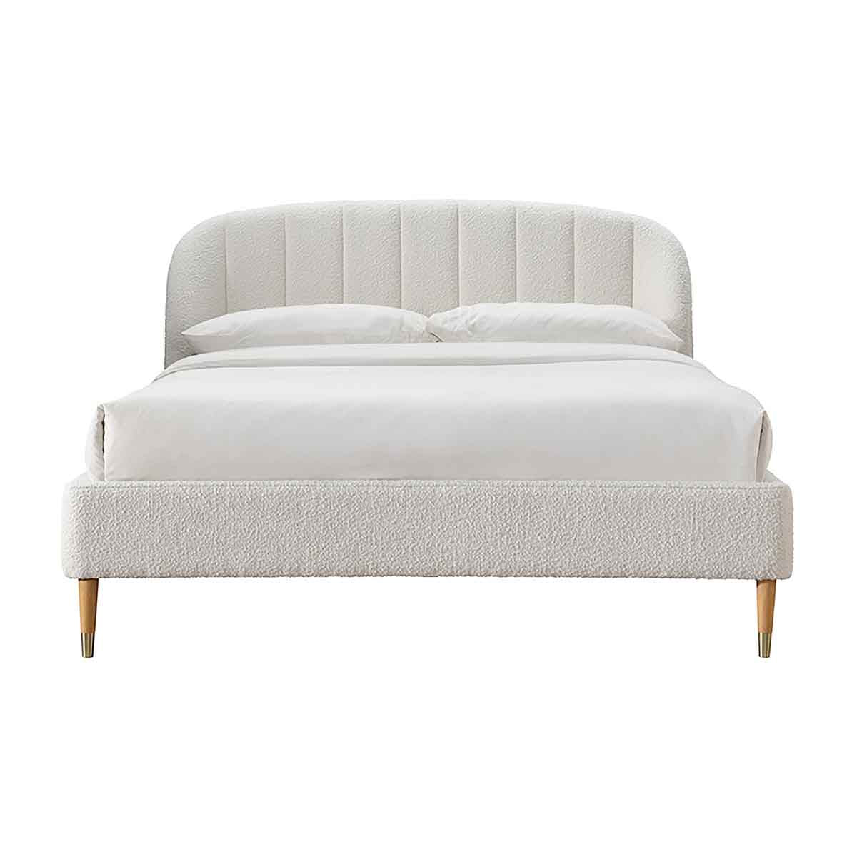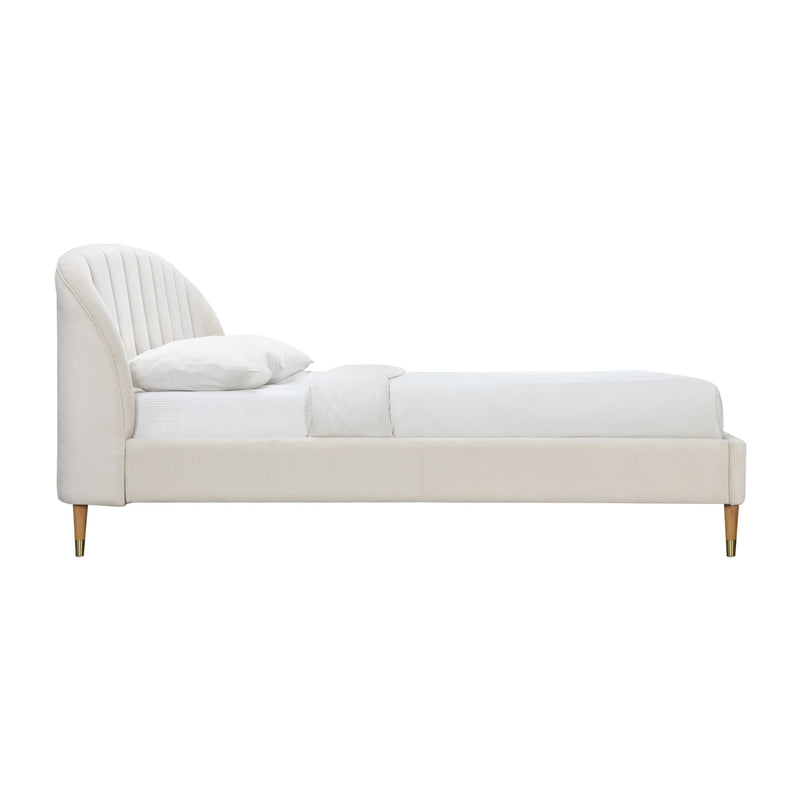 Luxe, classic design, pleat detailing, padded and upholstered bed head and frame, solid timber legs, brushed brass feet caps.