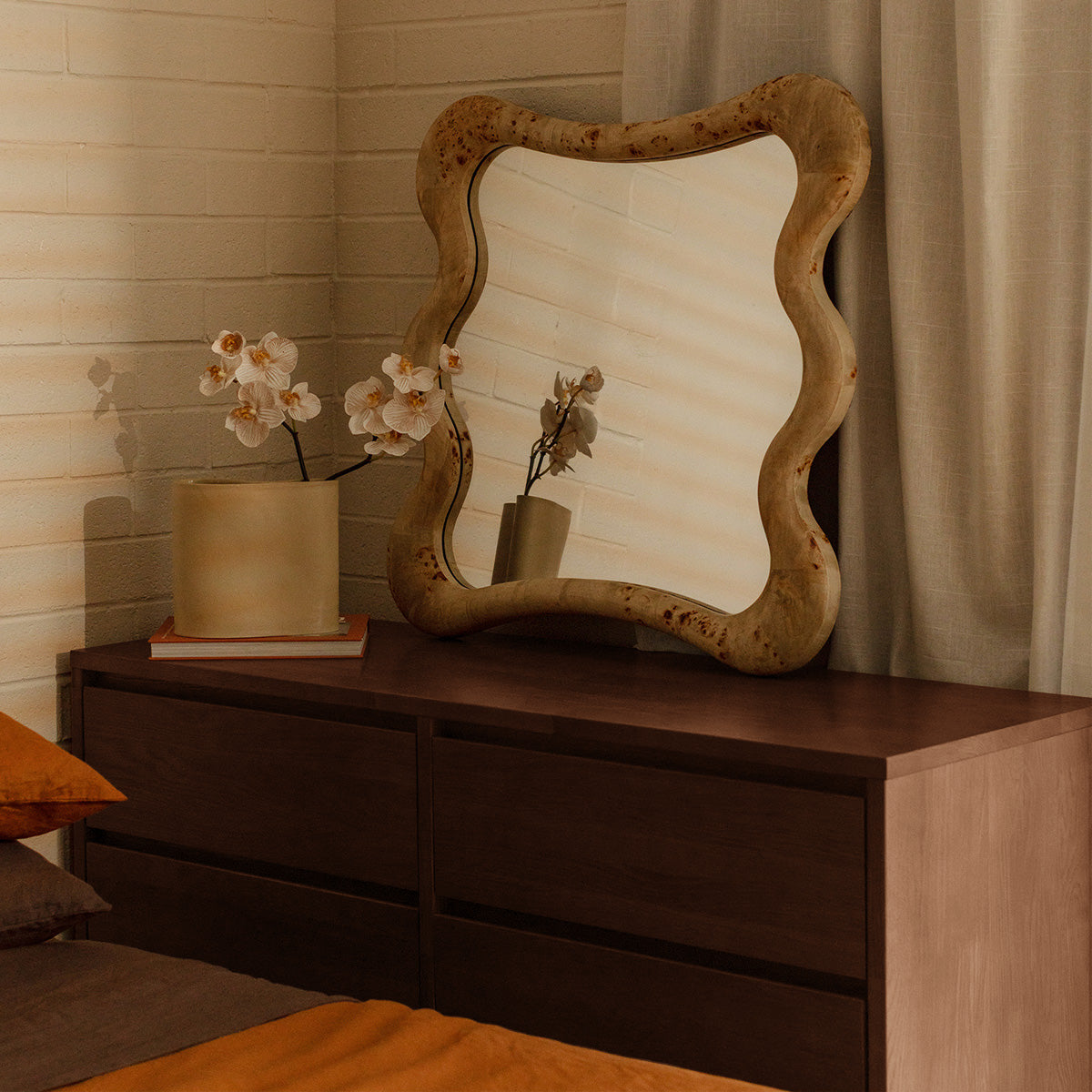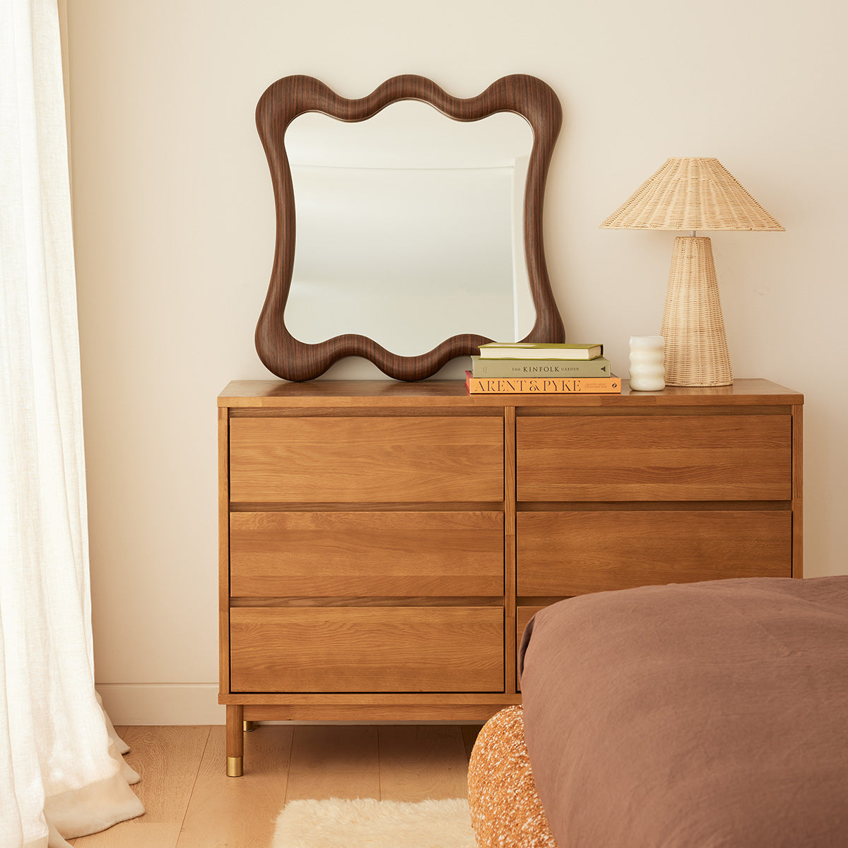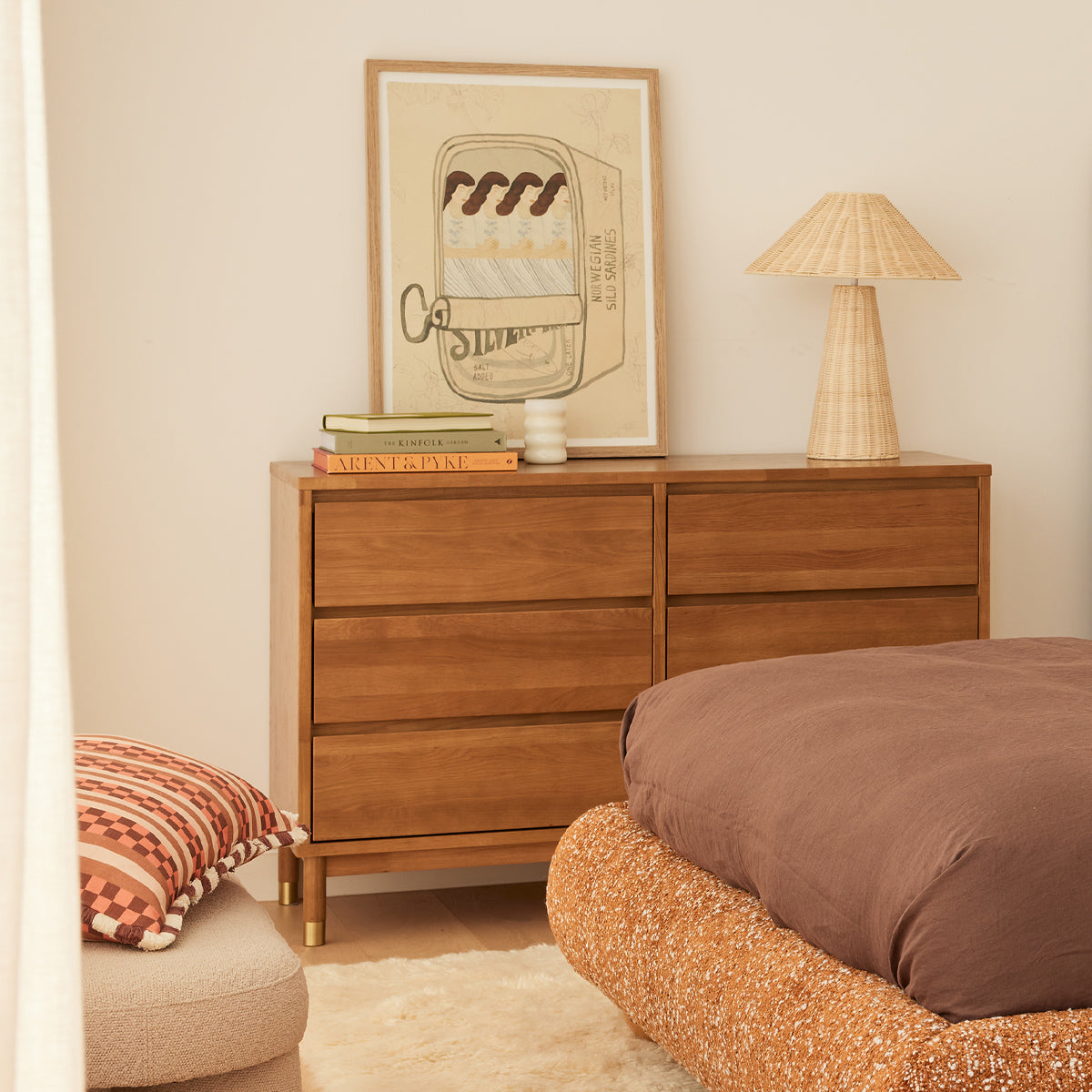 The Marlo Chest of Drawers combines timeless design with practical functionality. Crafted from warm-toned wood, its sleek frame features six spacious drawers, offering ample storage for your essentials. The minimalist silhouette is complemented by subtle brass-capped legs, adding a refined touch. Perfect for contemporary or classic interiors, this piece brings natural texture and warmth to any bedroom or living space. Whether styled with decor or left understated, the Marlo Chest of Drawers enhances any home with effortless sophistication.