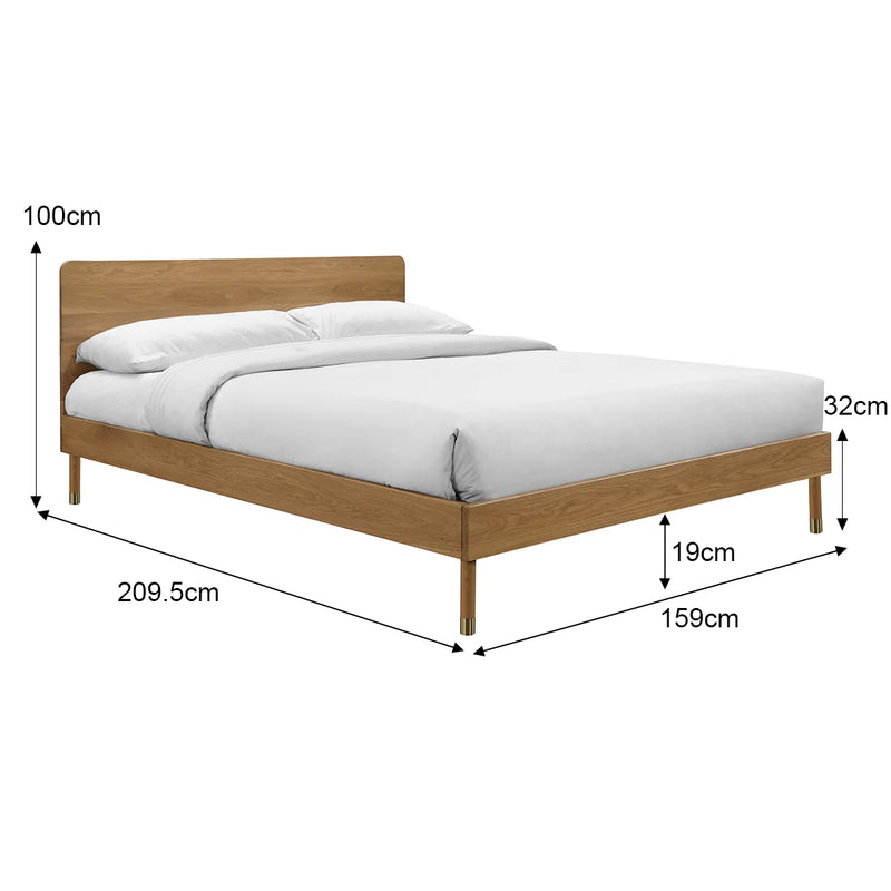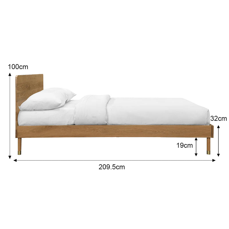 The Marlo Bed is a clean and pared-back bed frame, with a natural timber veneer headboard and solid timber legs. With design detailing in the rounded corners and brass feet, it is a timeless option for your bedroom. Browse our range of matching bedsides to complete the look.