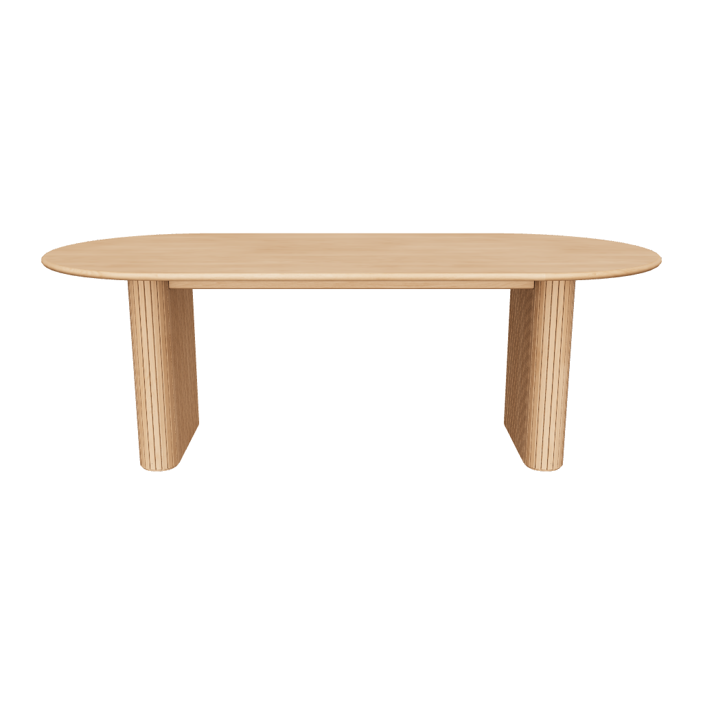The two curved legs complement the oval shaped top, and feature stunning timber paneling details to add visual interest to its simple form.